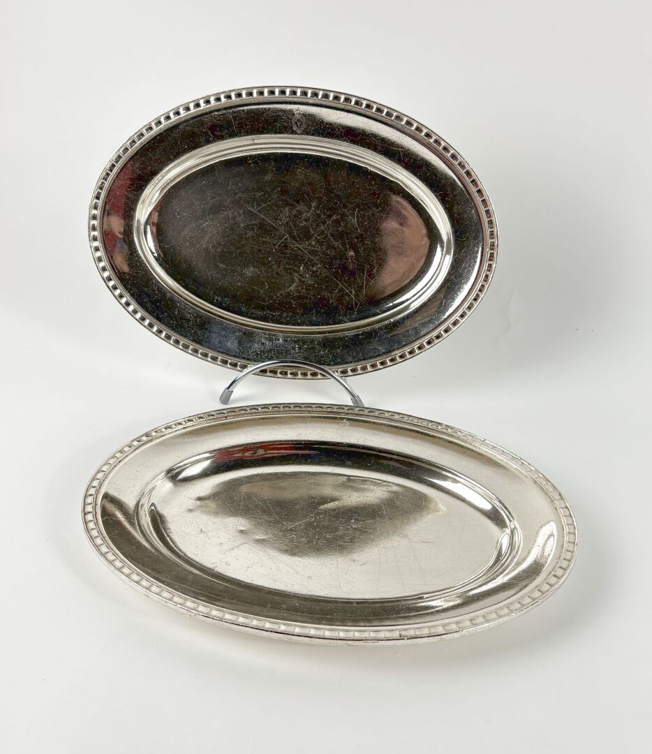 CHRISTOFLE pour l'Hotel Georges V Suite de deux petits plats ovales en métal argenté frappés du blason de l'établissement Etat d'usage L : 29.5 cm