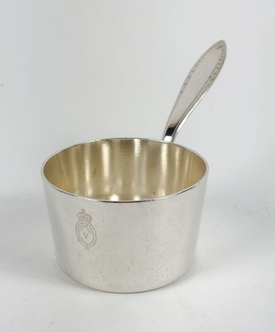 CHRISTOFLE pour l'Hotel Georges V Petite casserole à chocolat ou alcool en métal argenté frappée du blason de l'établissement Etat d'usage L : 12.5 cm