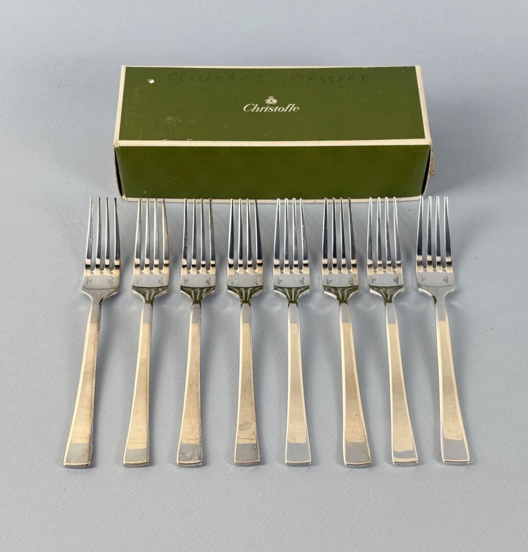 CHRISTOFLE Modèle Concorde - Suite de huit fourchettes à dessert en métal argenté Dans une boite