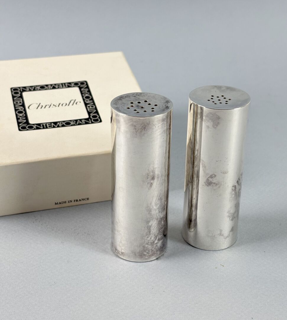 CHRISTOFLE Modèle Concorde - Salière et poivrière en métal argenté Dans leur boite d'origine H : 8 cm