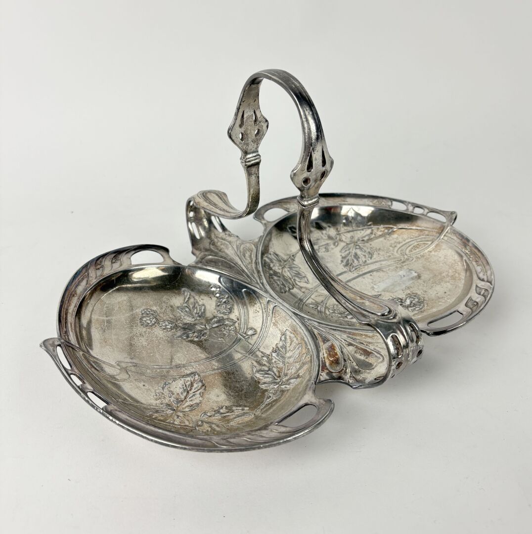 GALIA Serviteur à deux compartiments en métal argenté partiellement ajouré à décor de mûres Travail vers 1900 Restauration ancienne et léger accident L : 30 - H : 17 cm