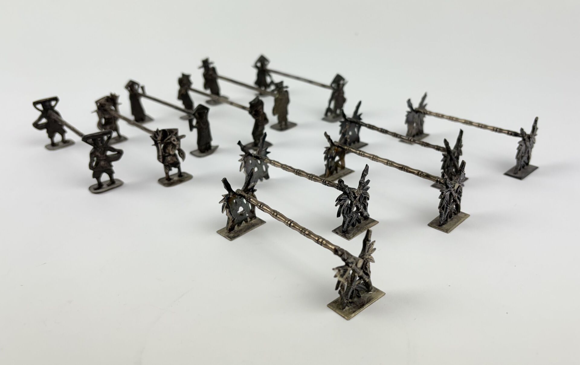 Suite de six porte-couteaux en métal argenté à décor dans le gout de l'Asie de bambou et de personnages asiatiques On y joint une suite de cinq porte-couteaux à décor de bambous (manque un pied)