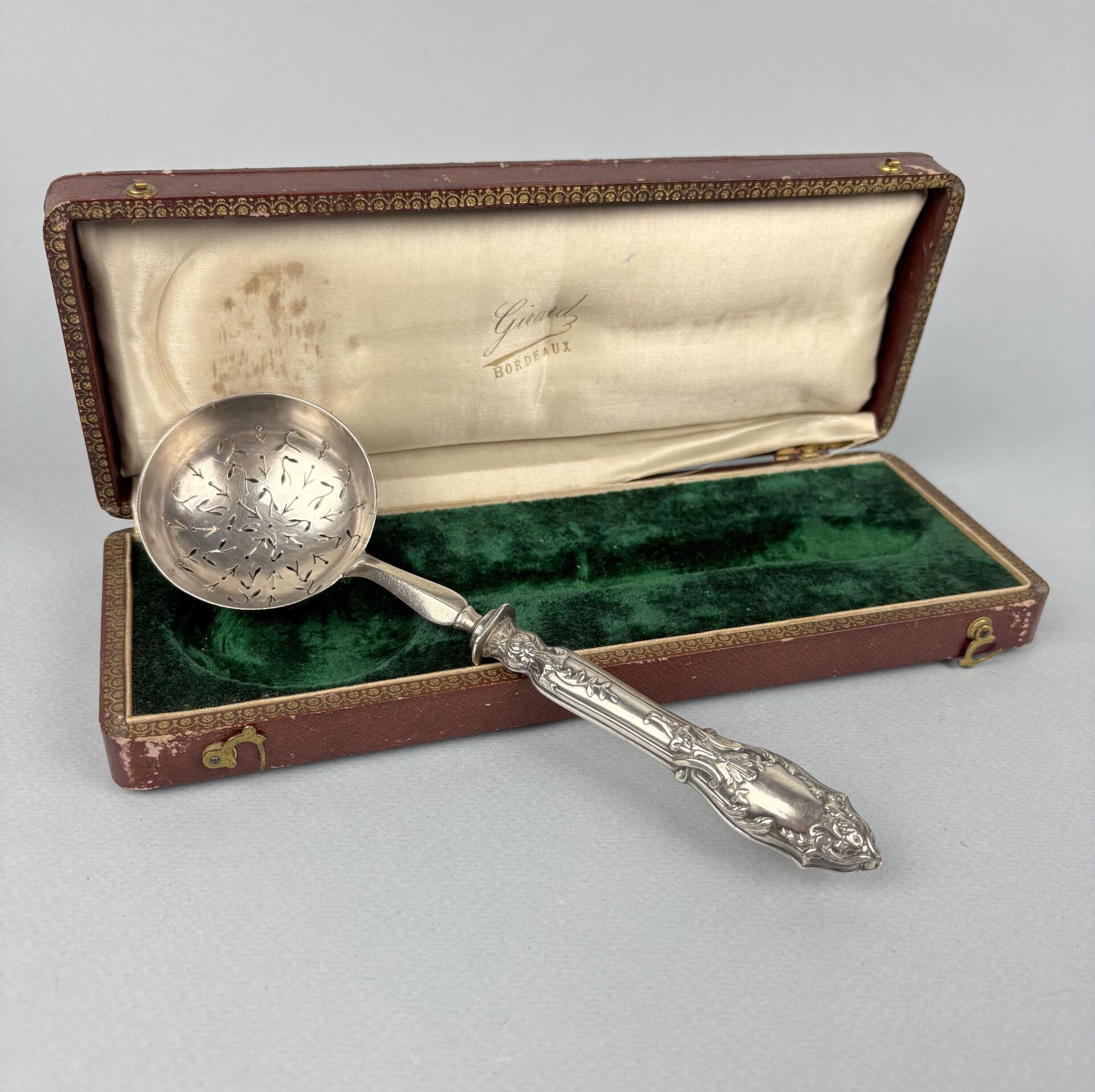 Cuillère à saupoudrer en métal argenté, le manche en argent fourré à décor de rinceaux Dans son écrin Poids brut : 82 g