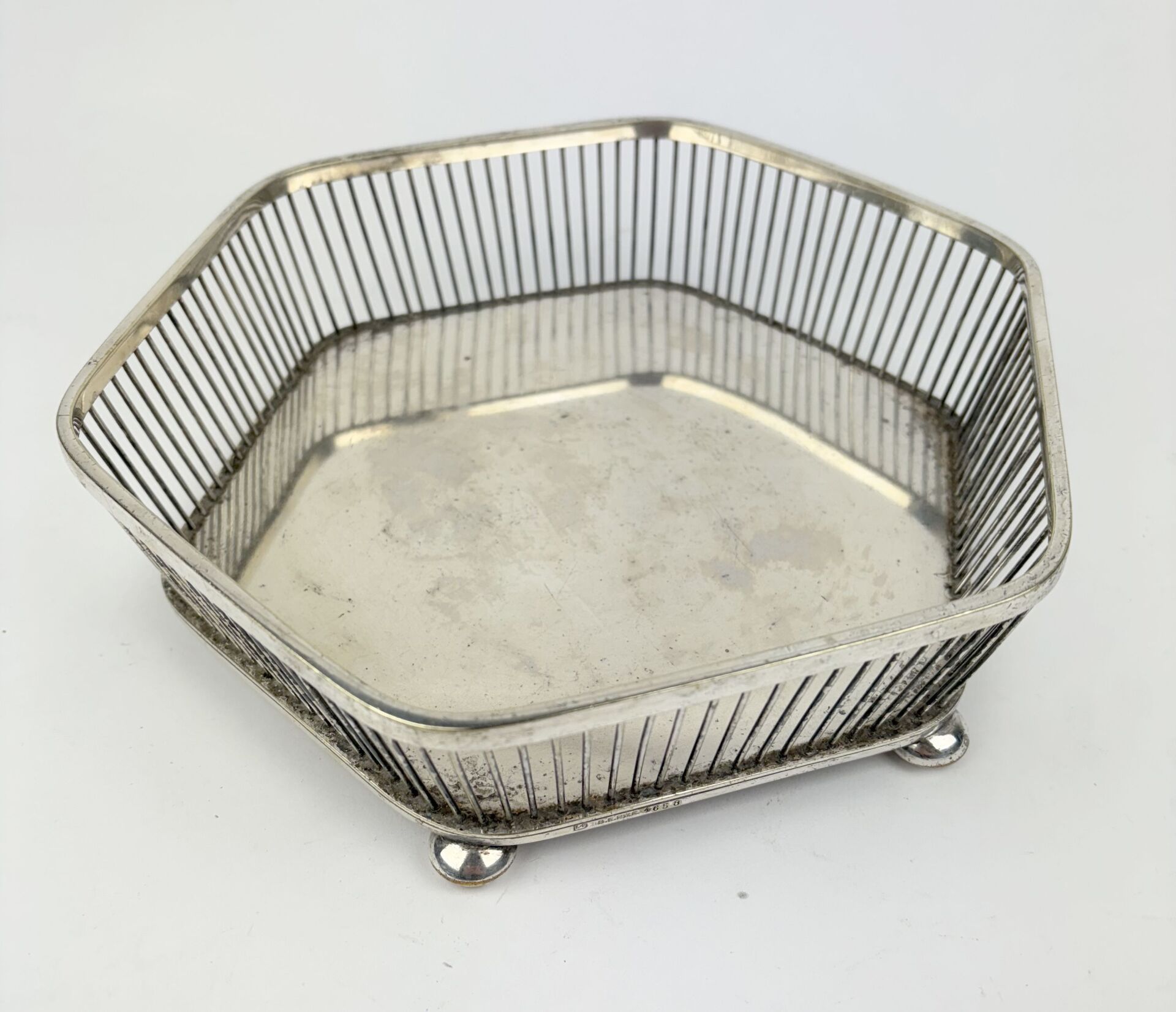 Corbeille à pain en métal argenté de forme hexagonale à bord ajouré reposant sur quatre pieds aplatis Travail vers 1900 D : 24 cm