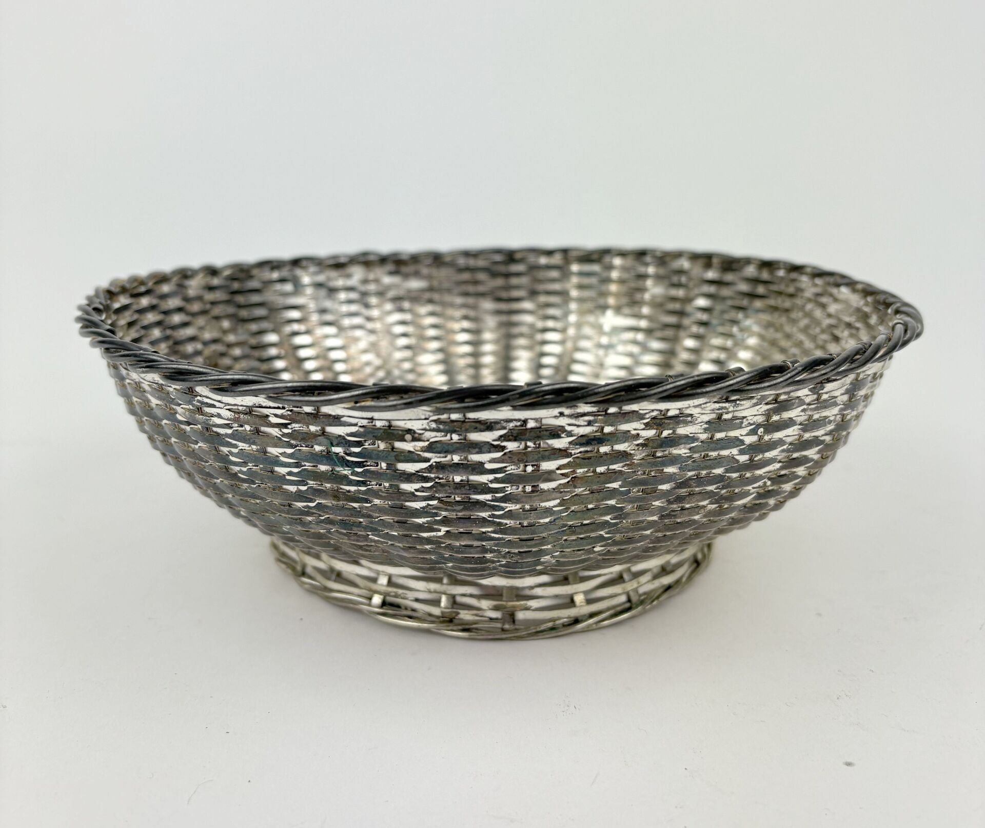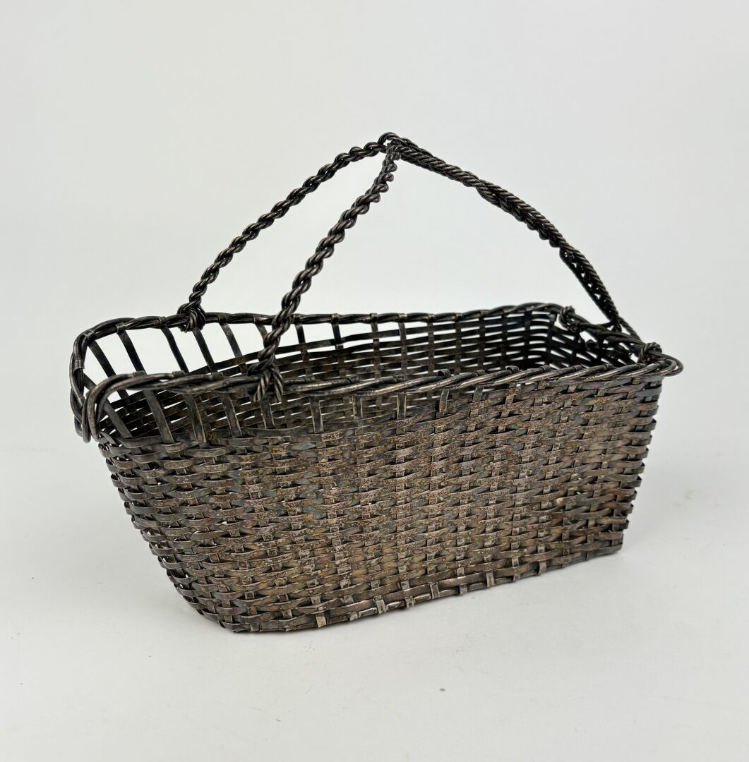 ORFEVRERIE CHRISTOFLE Corbeille sur talon en métal argenté à l'imitation de la vannerie Travail vers 1900 Usures D : 22.5 cm