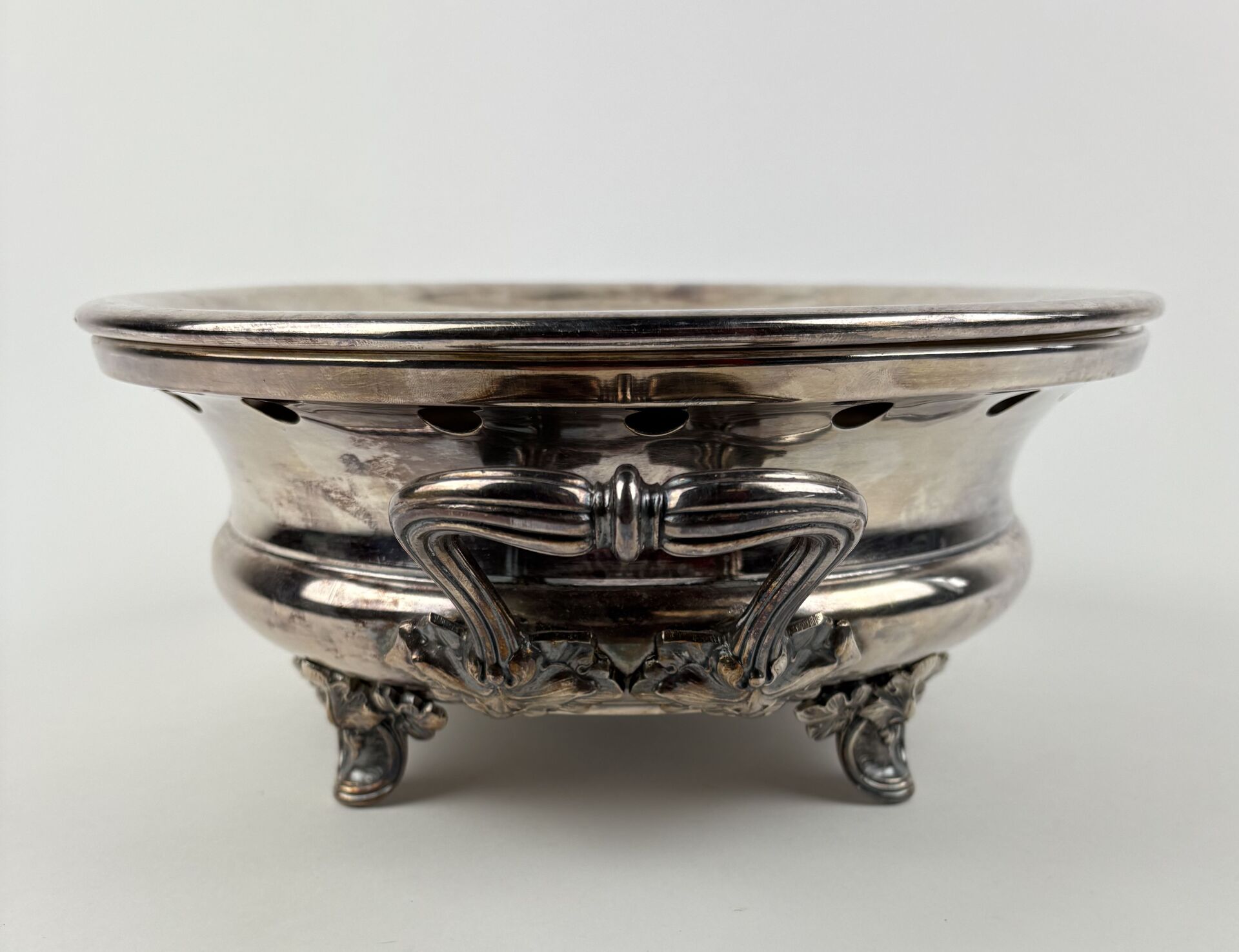 CHRISTOFLE Chauffe plat en métal argenté à décor d'Iris complet de son bruleur Travail vers 1900 D : 30 cm