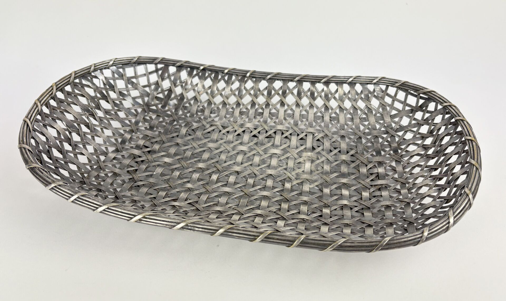 Porte bouteille en métal argenté tressé à l'imitation de la vannerie H : 18 - L : 25 - P : 10 cm