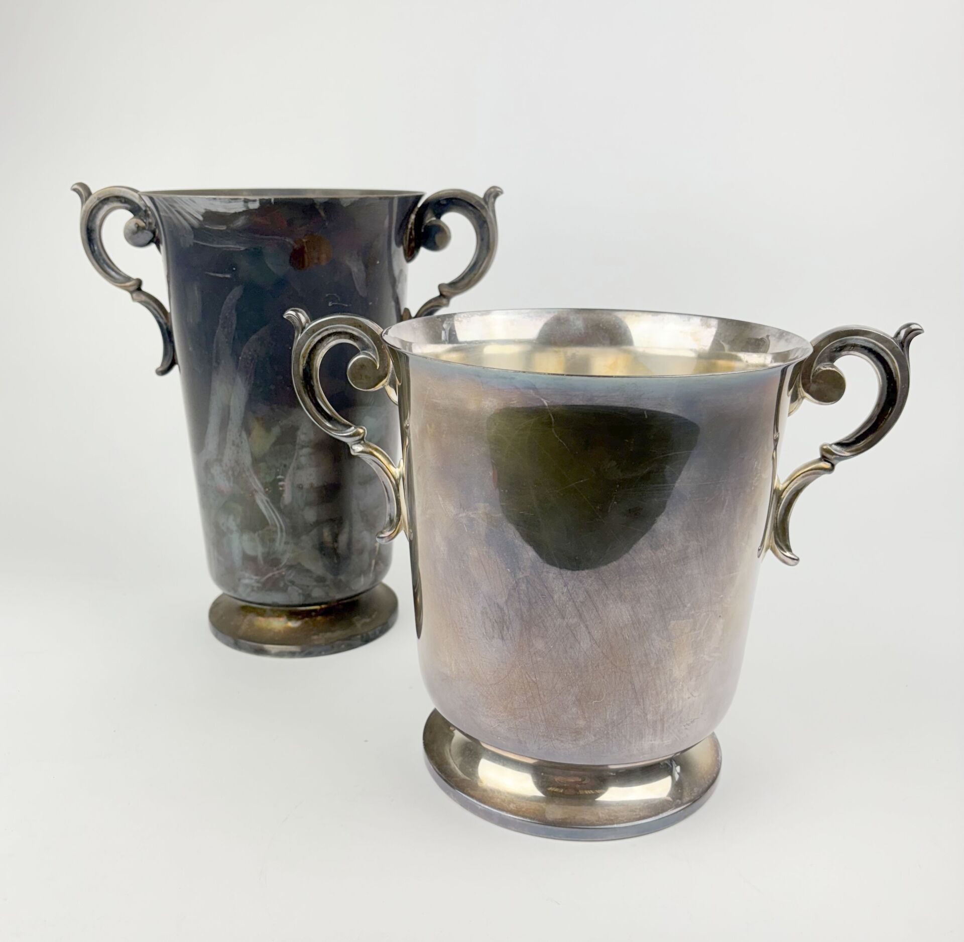 RENEKA Seau à bouteille et seau à champagne en métal argenté à deux anses figurant des rinceaux Rayures d'usage, oxydations et enfoncements H : 23.5 et 28 cm