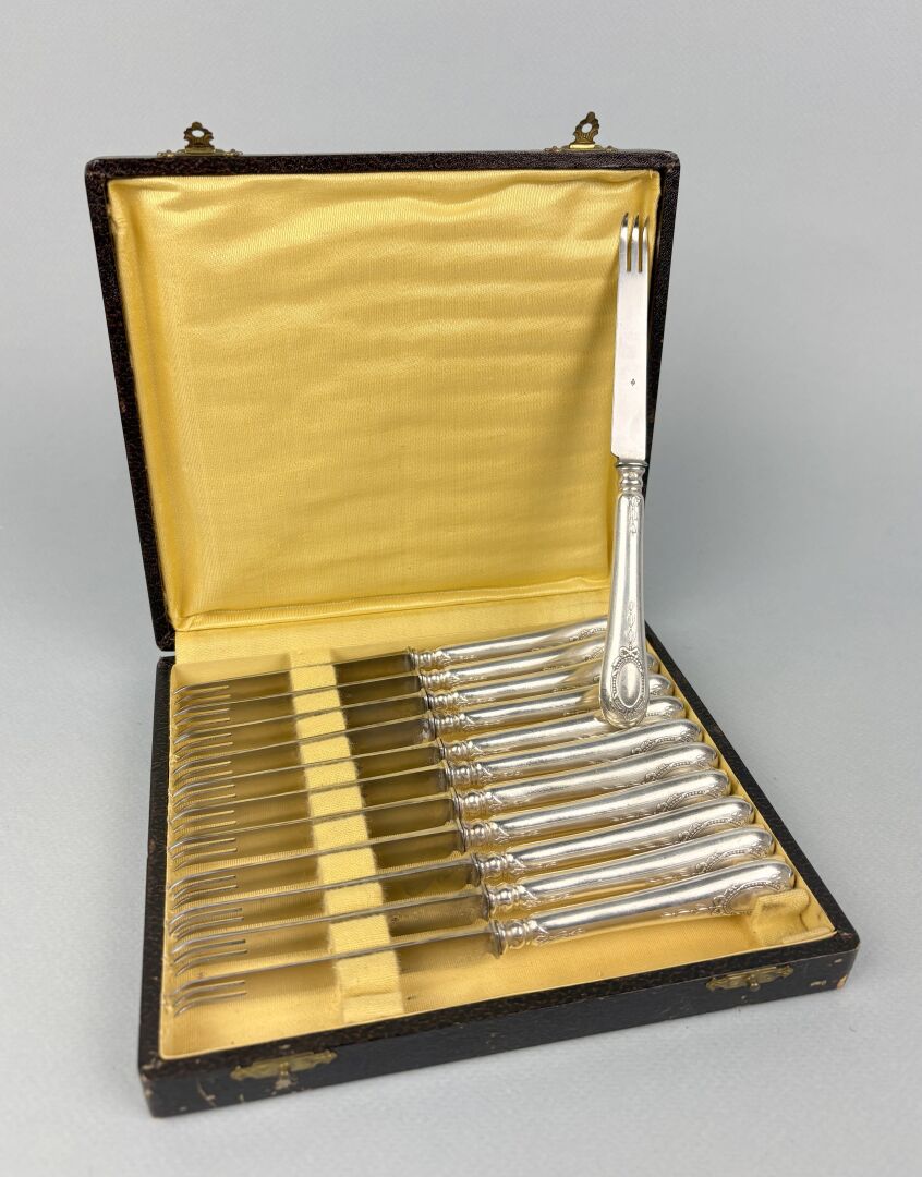 Suite de douze fourchettes à melon en métal argenté et inox, le manche à décor de blason perlé et rubané Travail XIX° Dans leur écrin