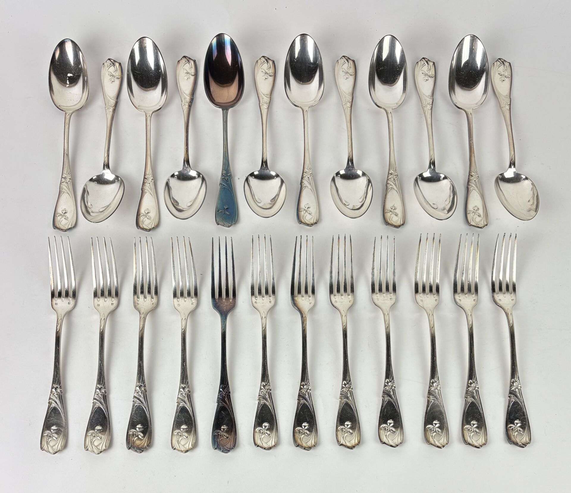 Suite de douze couverts de table en métal argenté à décor aux iris chiffrés "TC" Travail d'époque Art Nouveau
