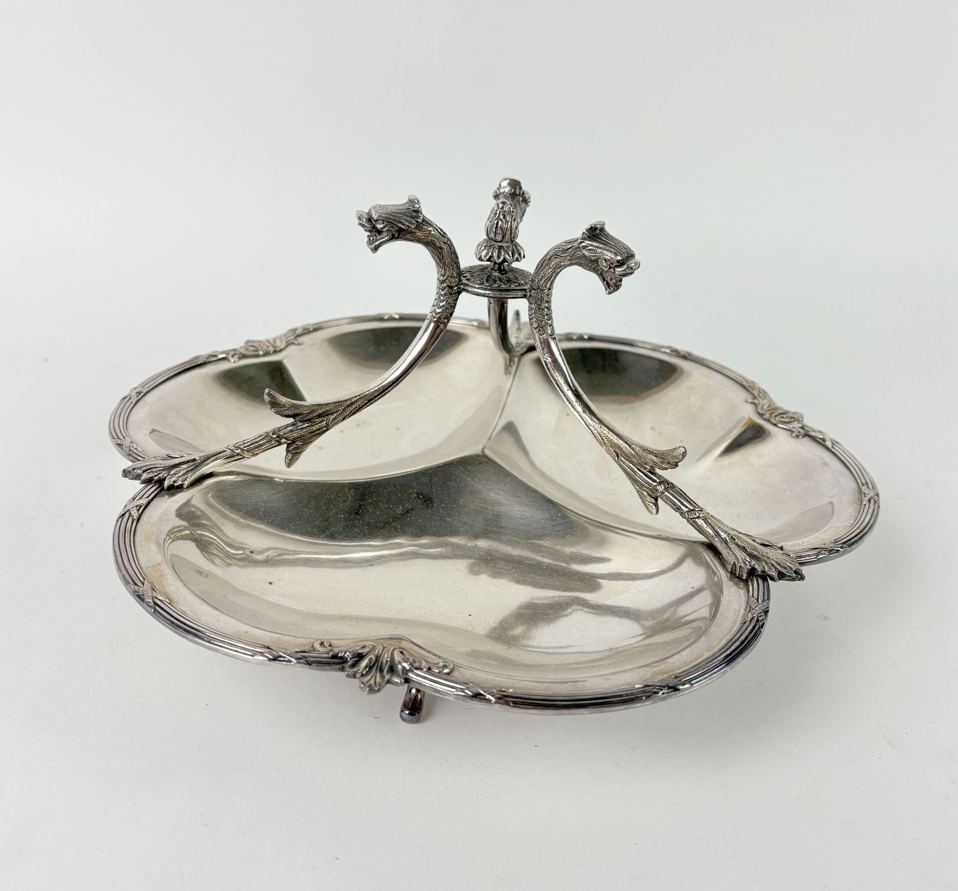 Serviteur à trois compartiments en métal argenté à décor de dauphins, feuilles d'acanthe et rubans croisés