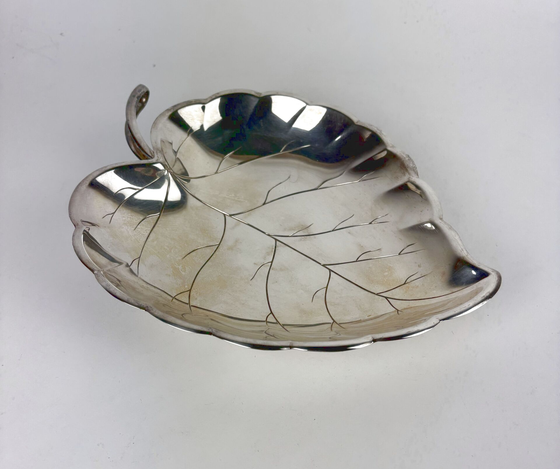Coupelle en métal argenté formant feuille reposant sur trois pieds boule L : 26 cm