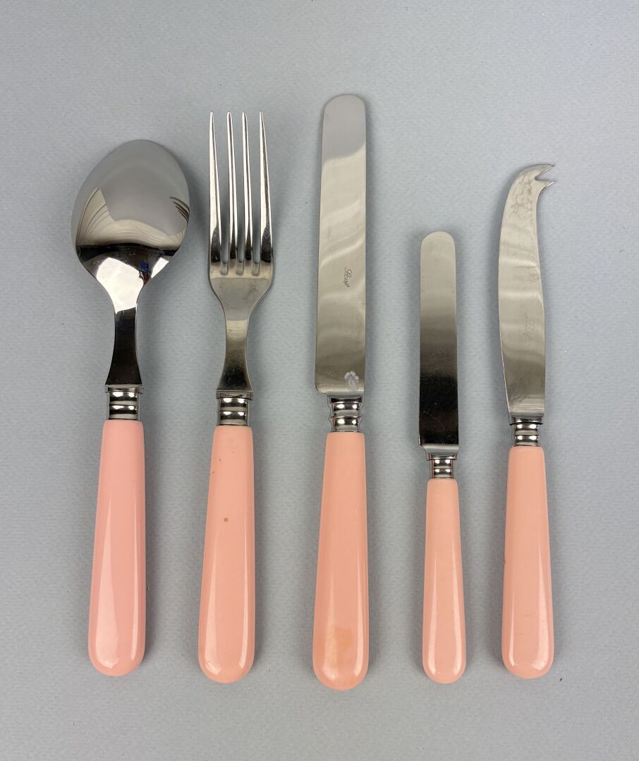 SCOF Partie de ménagère en inox et résine rose comprenant : - 6 Couverts de table - 6 Couteaux de table - 5 Couteaux à fruits - 1 Couteau à fromage