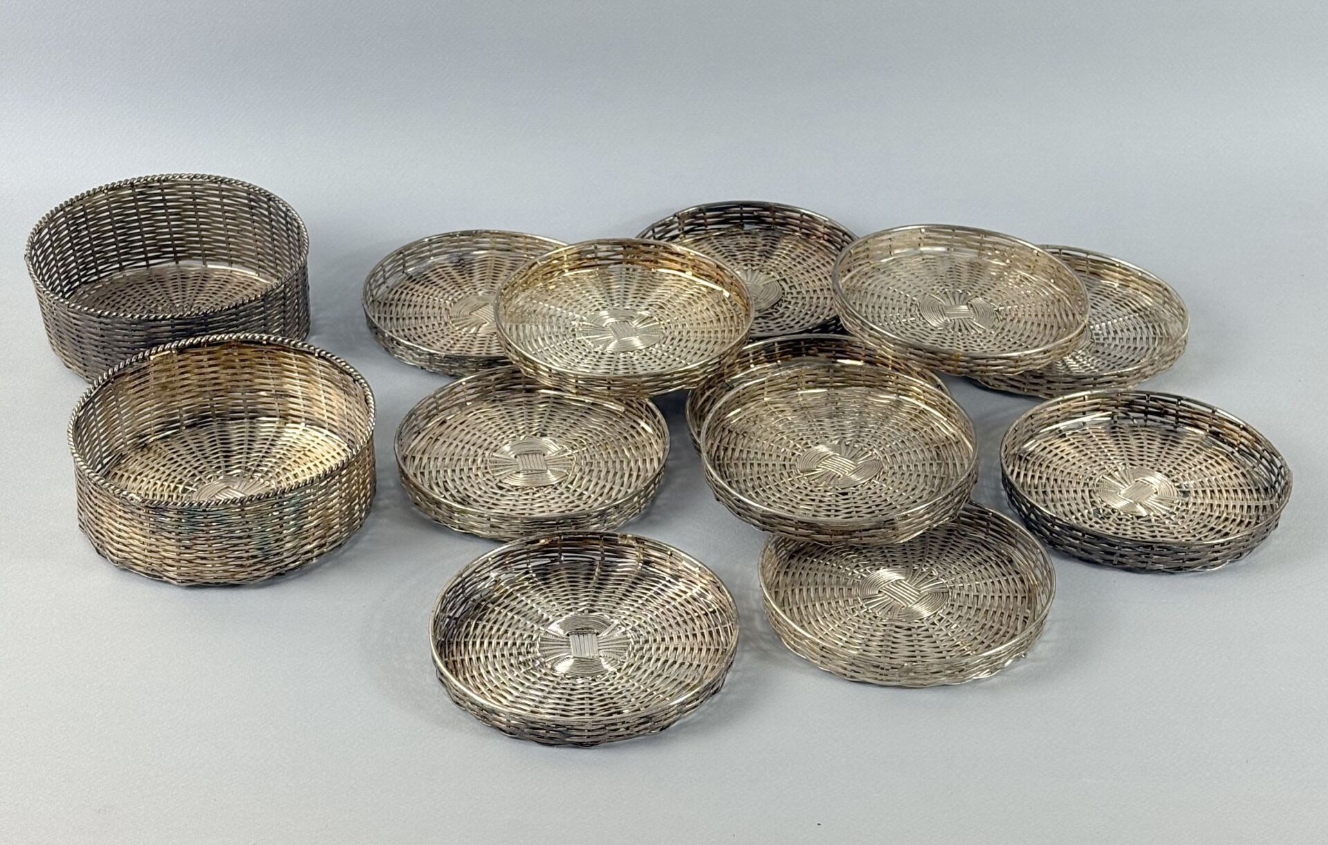 Suite de onze assiettes à pain et deux dessous de bouteille en métal argenté tressé à l'imitation de la vannerie