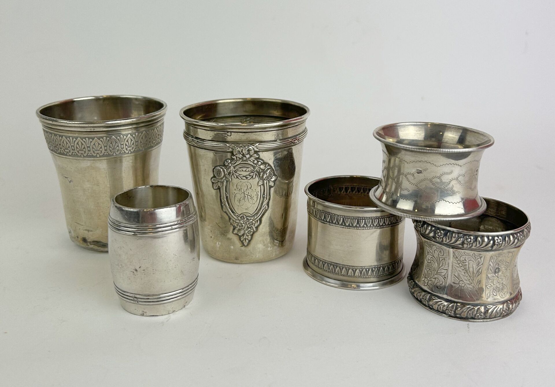 Ensemble en argent (925 millièmes), poinçon Minerve comprenant : - 3 Ronds de serviette - 2 Timbales (chocs et déformations) On y joint un pot à cure-dents en métal argenté de forme tonneau en métal argenté (petits chocs)