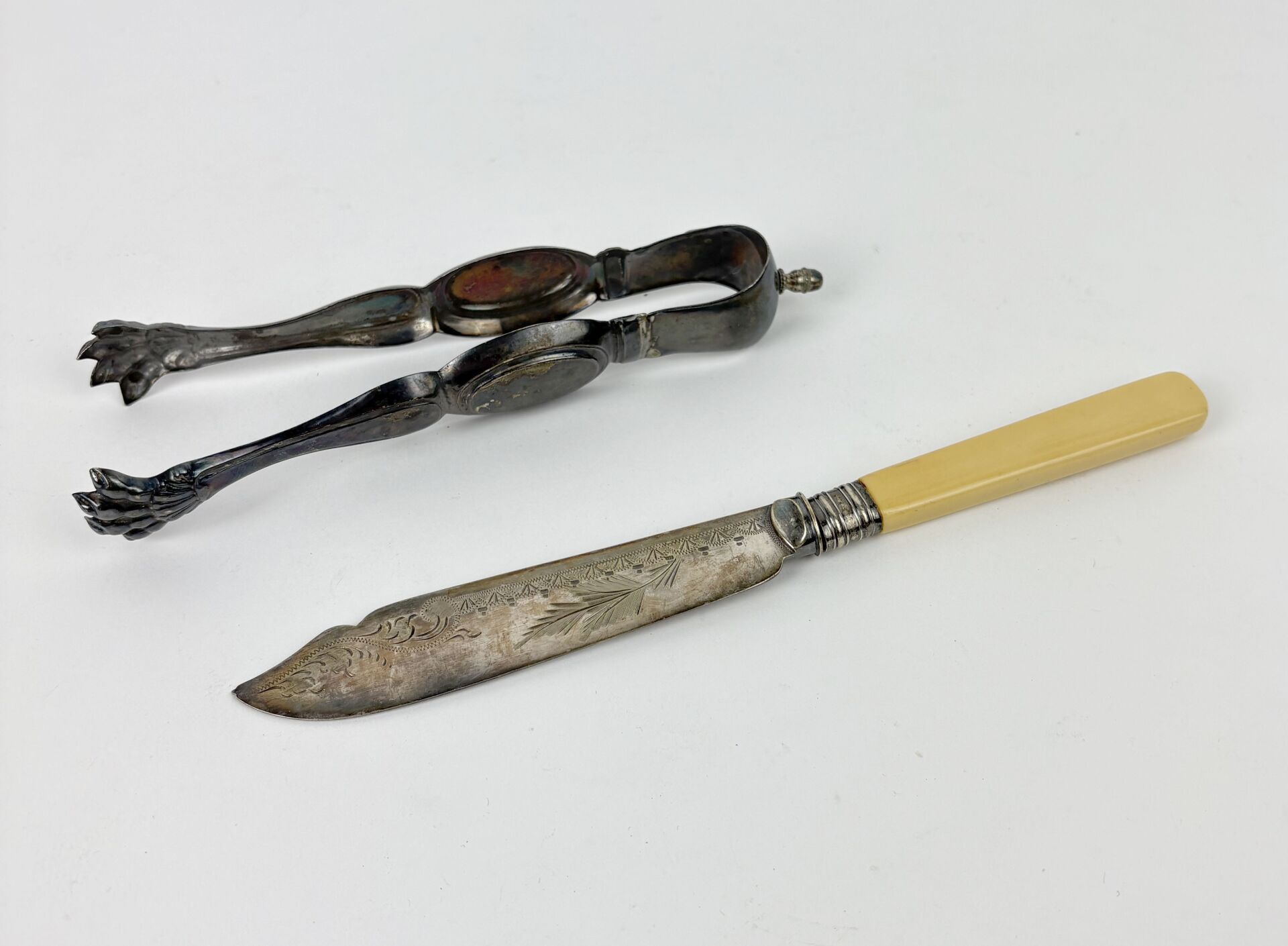Couteau à lame en argent anglais, manche en résine On y joint une pince à sucre en argent (925 millièmes), poinçon minerve Poids Brut : 89 g.