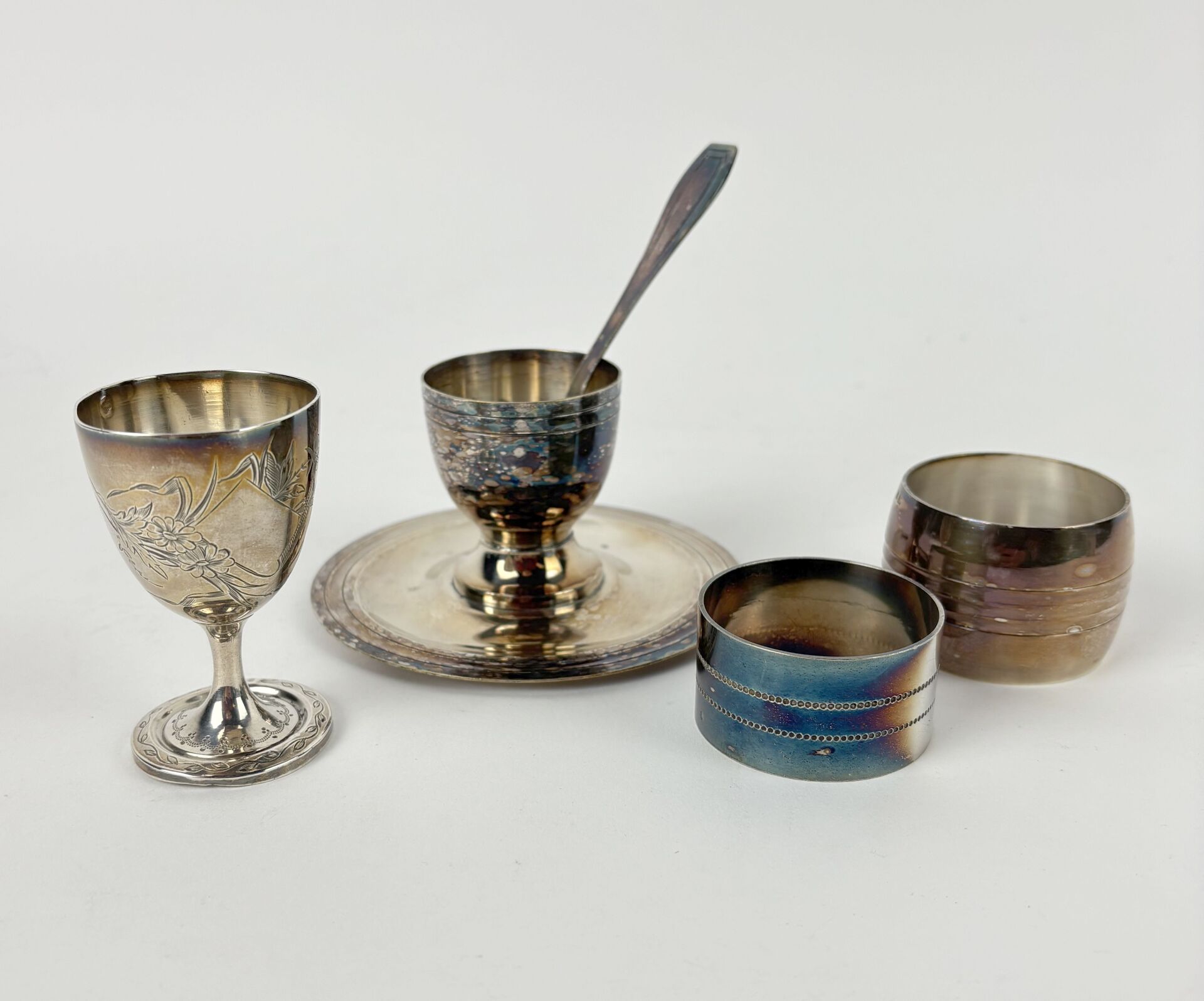 Deux coquetiers, l'un en argent (925 millièmes), poinçon Minerve à décor de fleurs, l'autre en métal argenté à large coupelle de style Art Déco avec sa cuillère. On y joint deux ronds de serviette