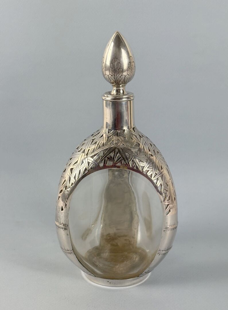 Carafe à whisky en verre, monture en argent à décor de bambou, le flacon portant la marque en relief sous la base "HAIG'S Whisky et UGB" Poids brut : H : 26 cm