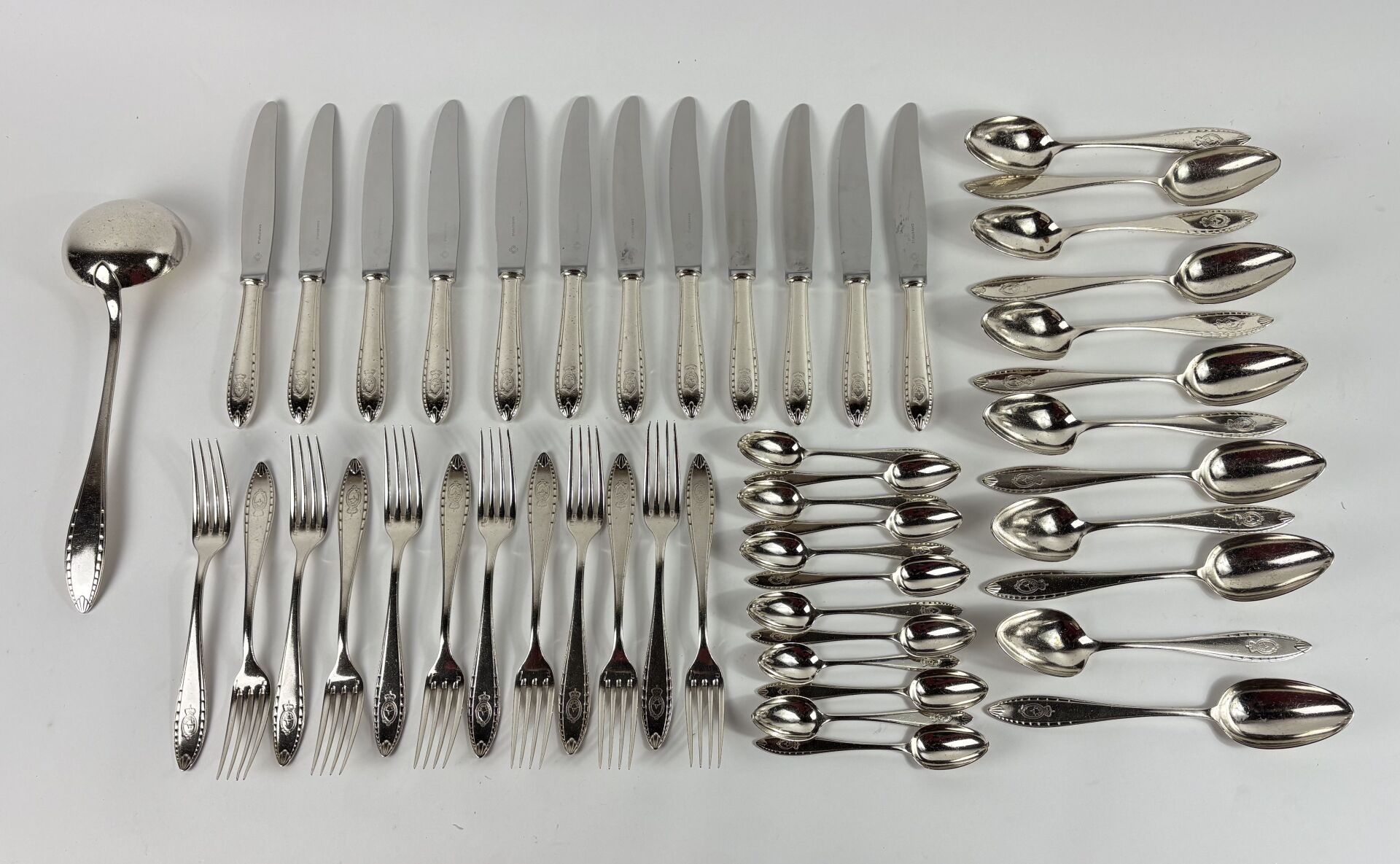 CHRISTOFLE pour l'Hotel Georges V Partie de ménagère en métal argenté frappée du blason de l'établissement comprenant : - 12 Couverts de table - 12 Couteaux de table - 12 Fourchettes à dessert - 12 Cuillères à café (une légèrement plus petite) - 1 Louche Etat d'usage