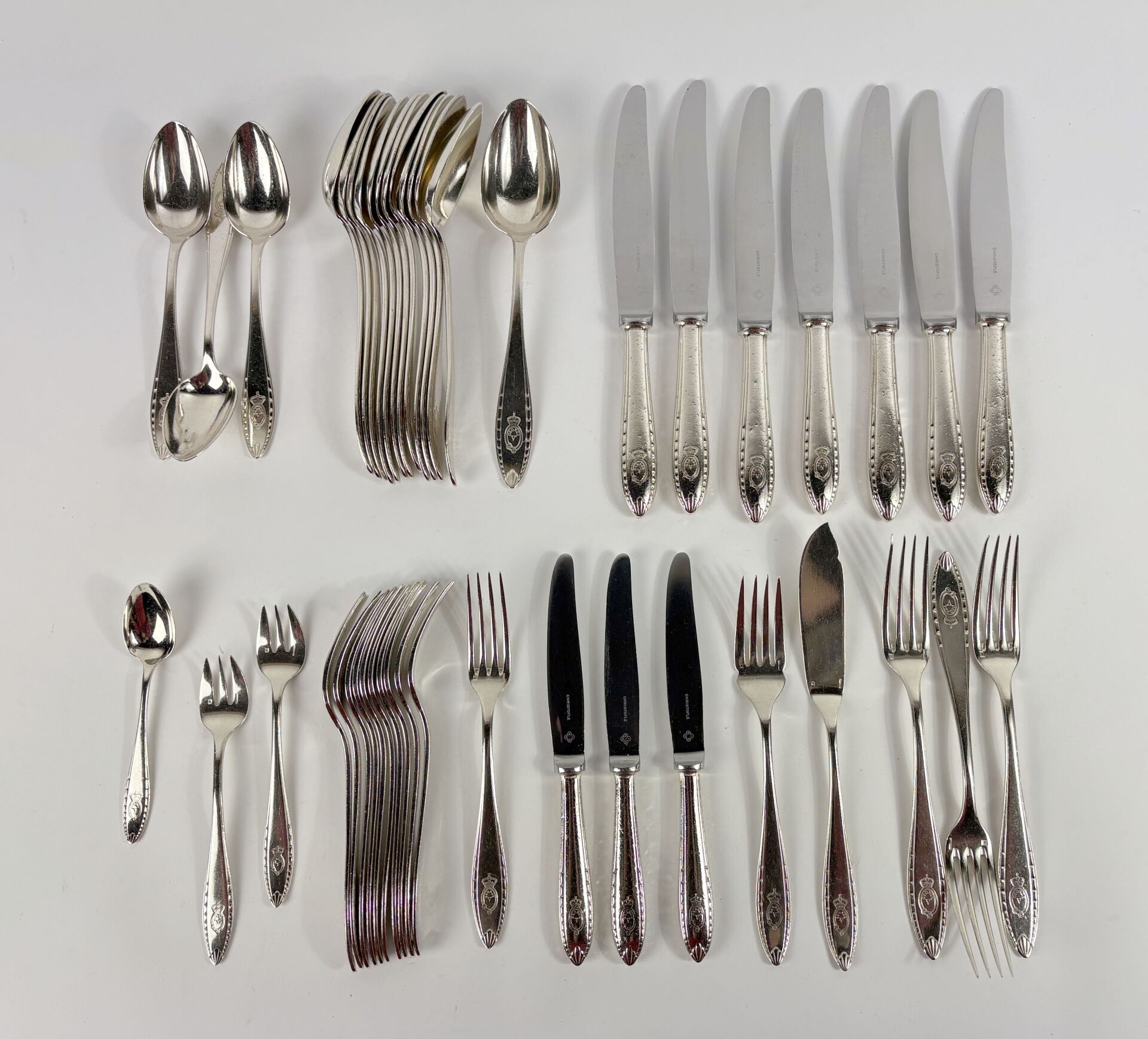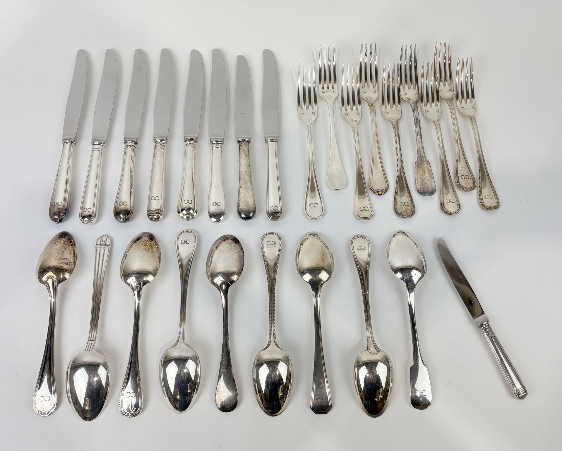 CHRISTOFLE pour l'Hotel Georges V Lot de couverts en métal argenté frappés du blason de l'établissement comprenant : - 7 Couteaux de table - 3 Fourchettes de table - 13 Cuillères de table - 3 Demi-cuillères - 11 Demi-fourchettes - 3 Demi-couteaux - 1 Couvert à poisson