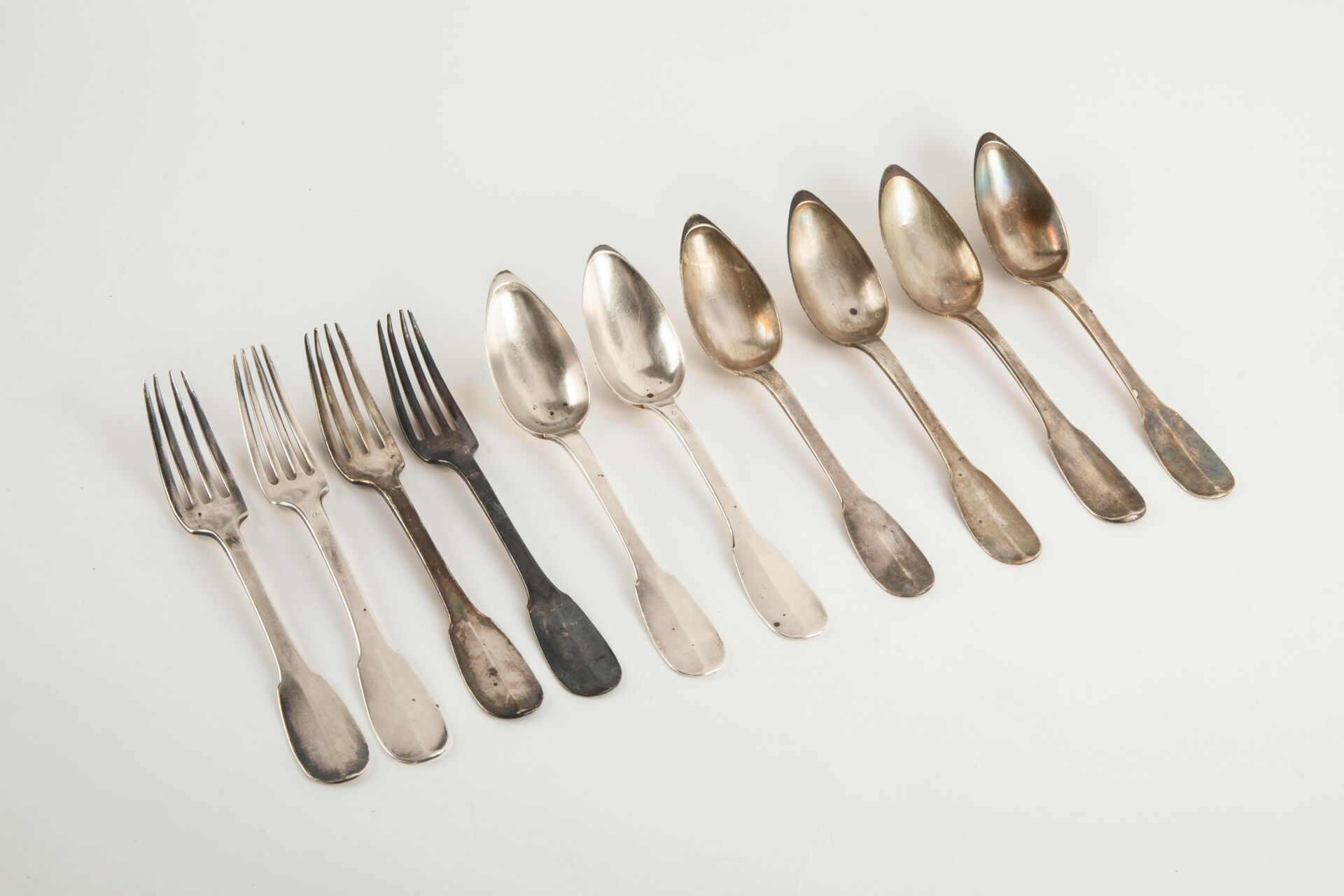 Suite de 3 couverts et une cuillère en argent (925 millièmes), poinçon Minerve modèle baguette armoiries sous une couronne Comtale On y joint un couvert au modèle avec des armoiries sous une couronne de Marquis Maitre Orfèvre : JUGE On y joint une cuillère au modèle