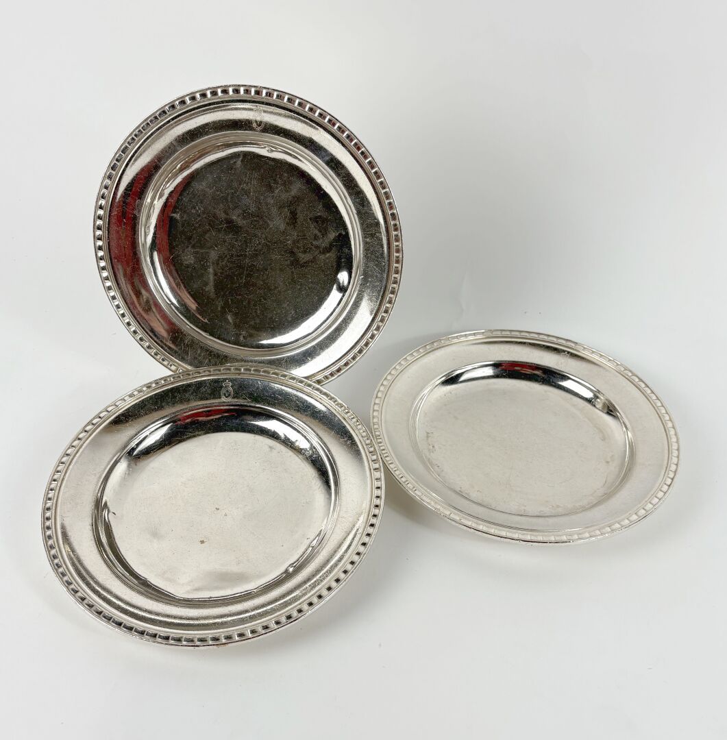 CHRISTOFLE pour l'Hotel Georges V Suite de trois plats ronds en métal argenté frappés du blason de l'établissement Etat d'usage D : 22.5 cm