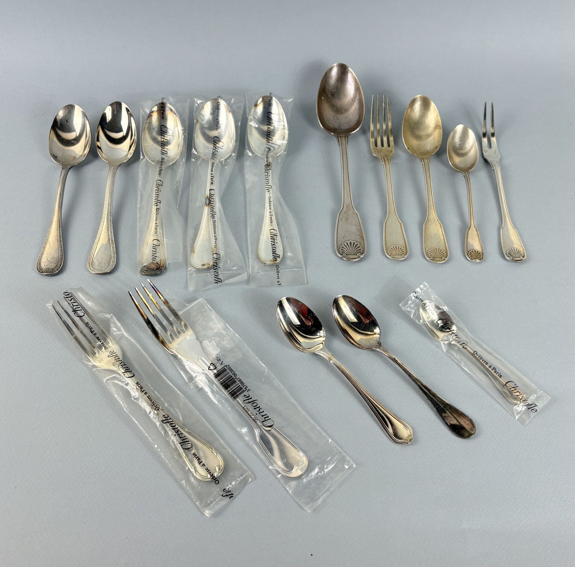 CHRISTOFLE Lot de couverts dépareillés en métal argenté, certains neufs sous blister comprenant : - 2 Cuillères à dessert - 4 Demi-cuillères Perles - 1 Demi fourchette Ruban Croisés - 1 Fourchette à poisson Chinon - 1 Demi-cuillère Malmaison - 1 Cuillère à moka On y joint