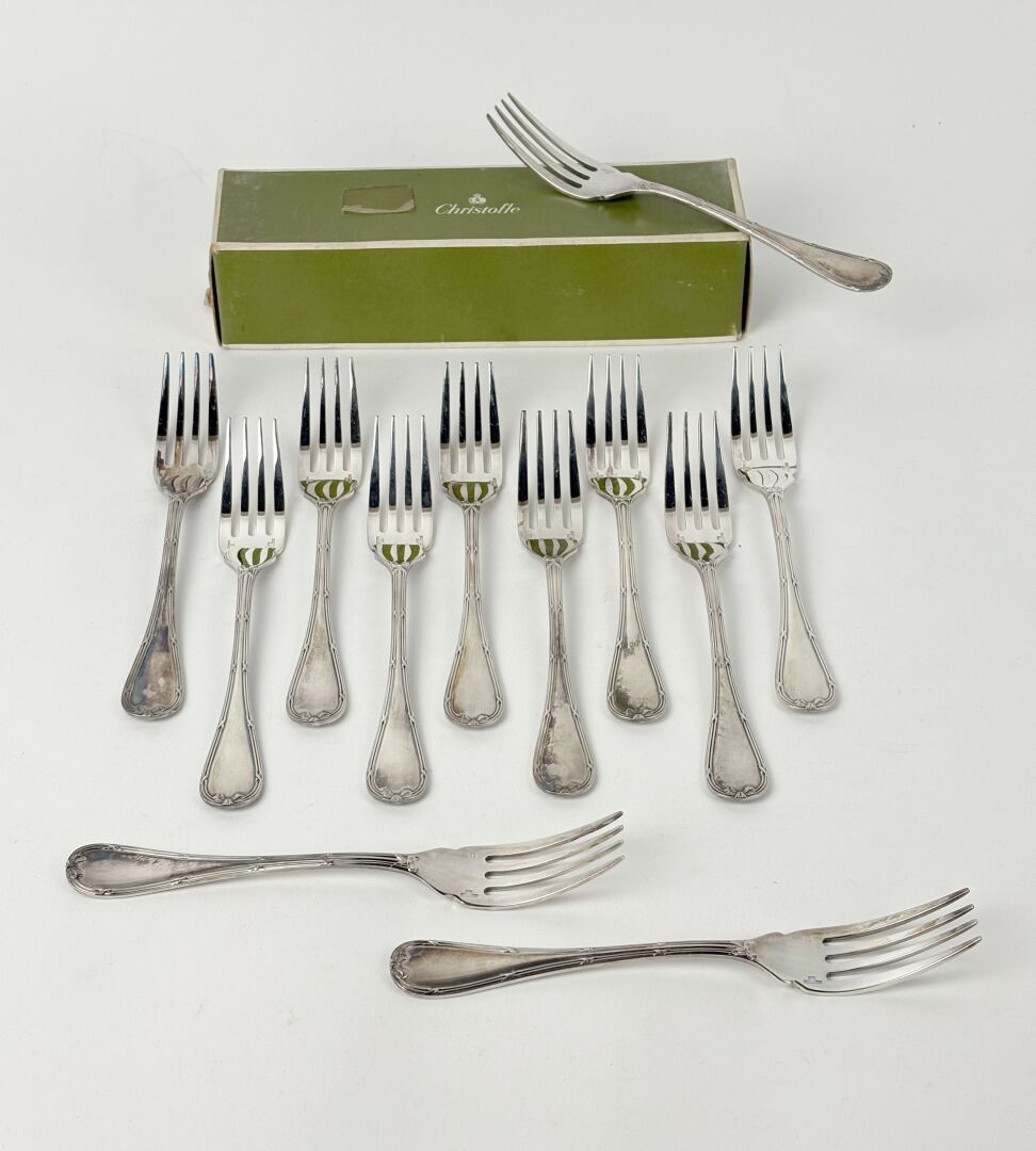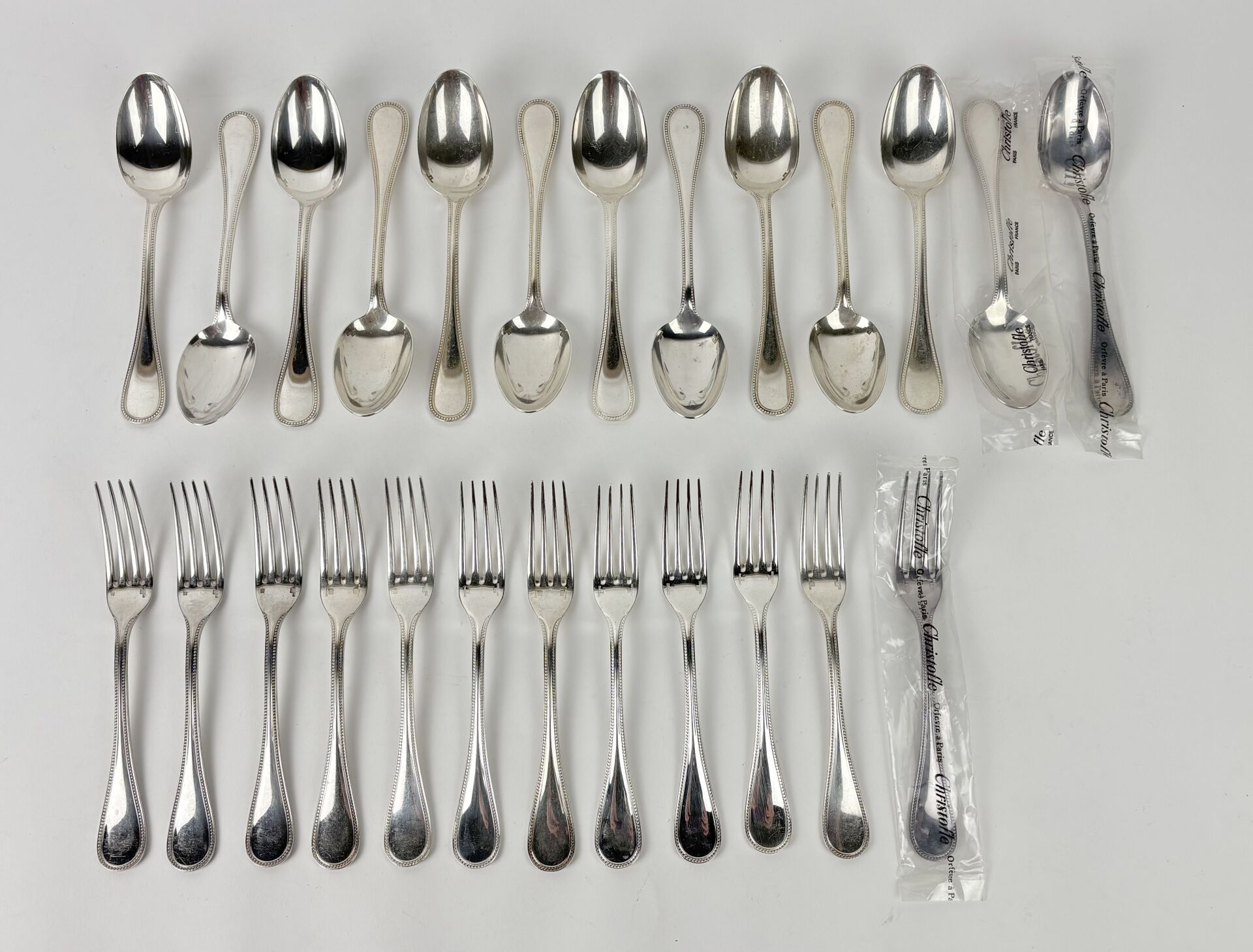 CHRISTOFLE Modèle Perles - Suite de douze demi-couverts en métal argenté Certains sous blister, dans une boite