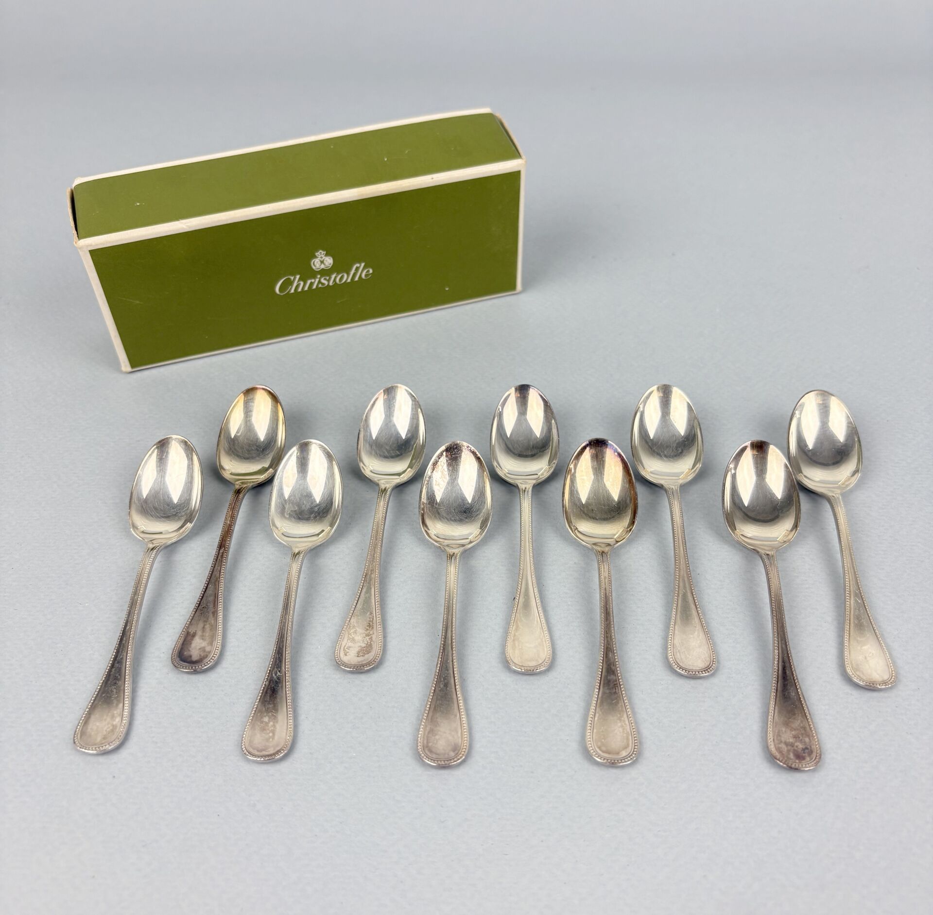 CHRISTOFLE Modèle Perles - Suite de dix cuillères à moka en métal argenté Dans leur écrin