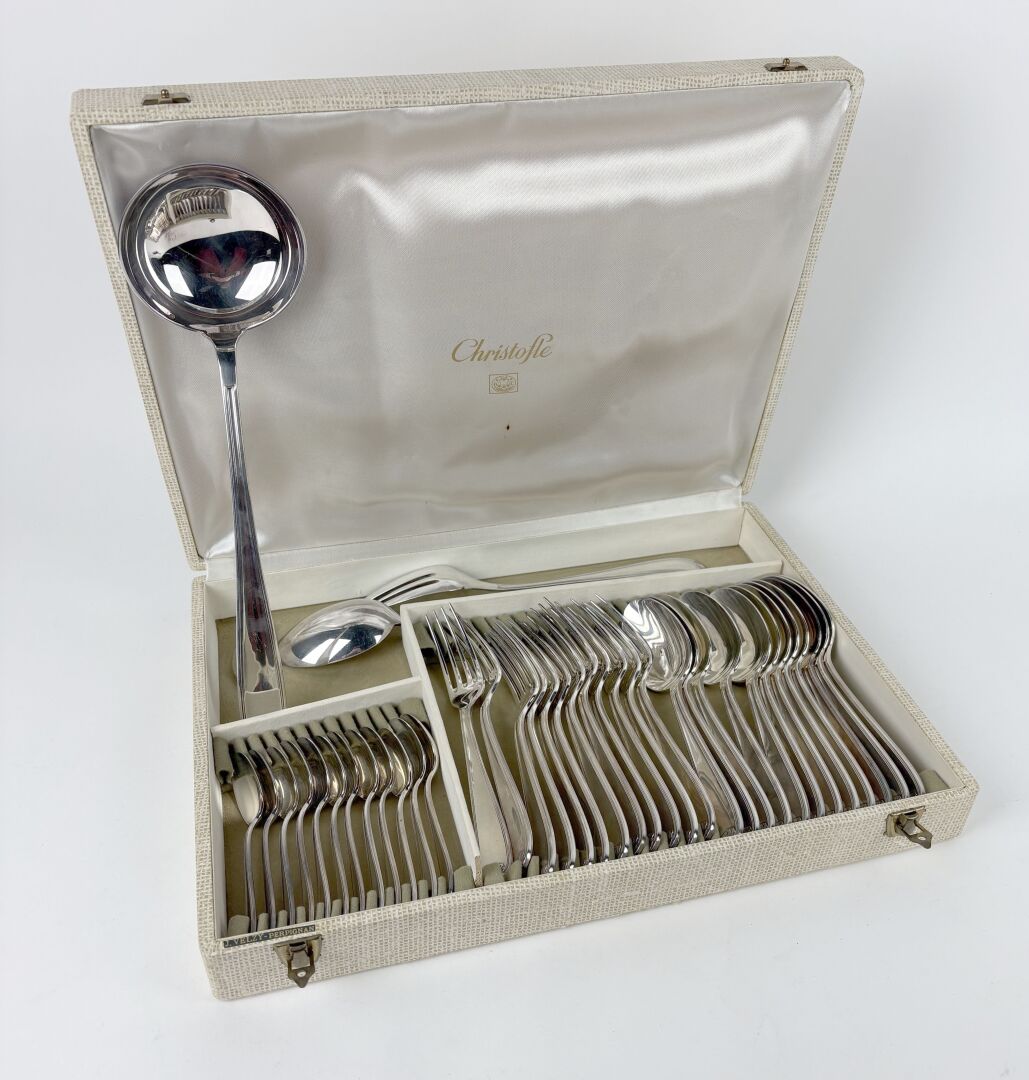 CHRISTOFLE Modèle Vendôme - Partie de ménagère en métal argenté comprenant : - 12 Couverts de table - 12 Cuillères à dessert - 1 Louche à potage Dans leur écrin d'origine