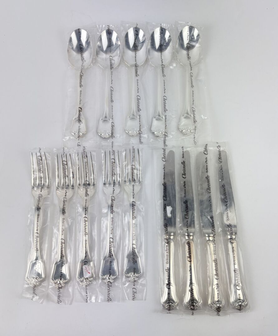 CHRISTOFLE Modèle Port Royal - Lot comprenant : - 5 Fourchettes de table - 5 Cuillères de table - 4 Couteaux de table Sous blister