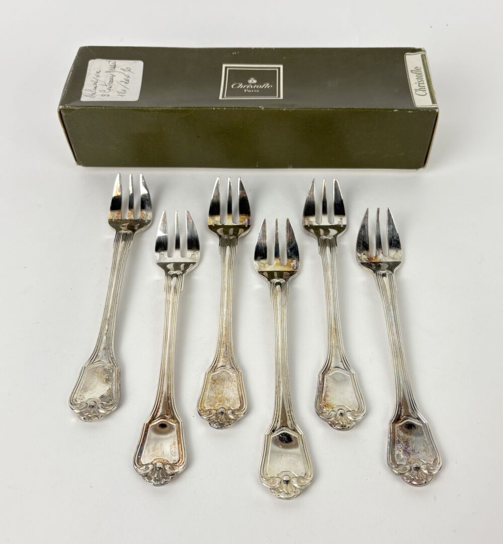 CHRISTOFLE Modèle Port Royal - Suite de six fourchettes à huitre en métal argenté Dans une boite