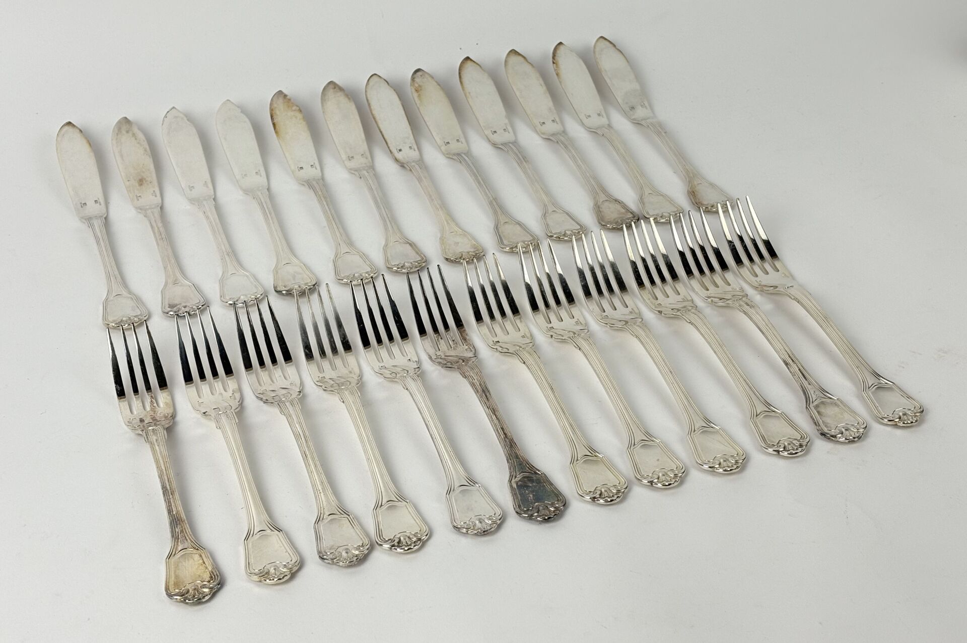 CHRISTOFLE Modèle Port Royal - Suite de douze couverts à poisson en métal argenté Dans une boite