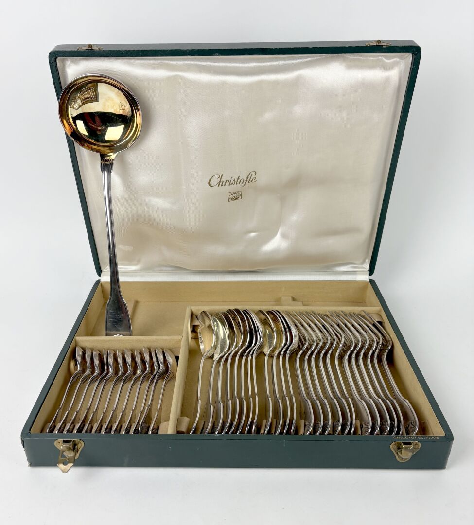 CHRISTOFLE Modèle Coquille - Partie de ménagère en métal argenté comprenant : - 12 Couverts de table - 12 Cuillères à dessert - 1 Louche à potage - Couverts à salade Dans leur écrin