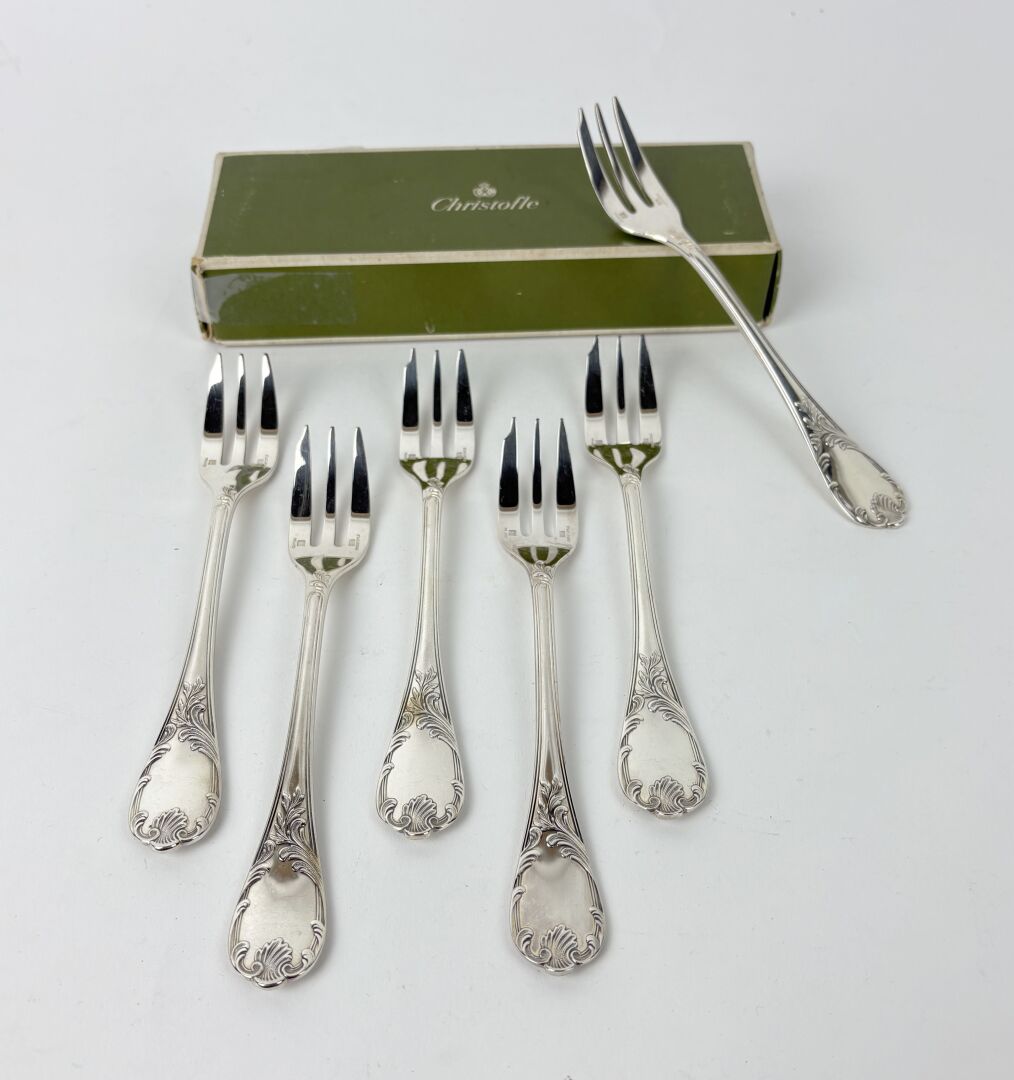 CHRISTOFLE Modèle Marly - Suite de six fourchettes à gâteau en métal argenté Dans une boite