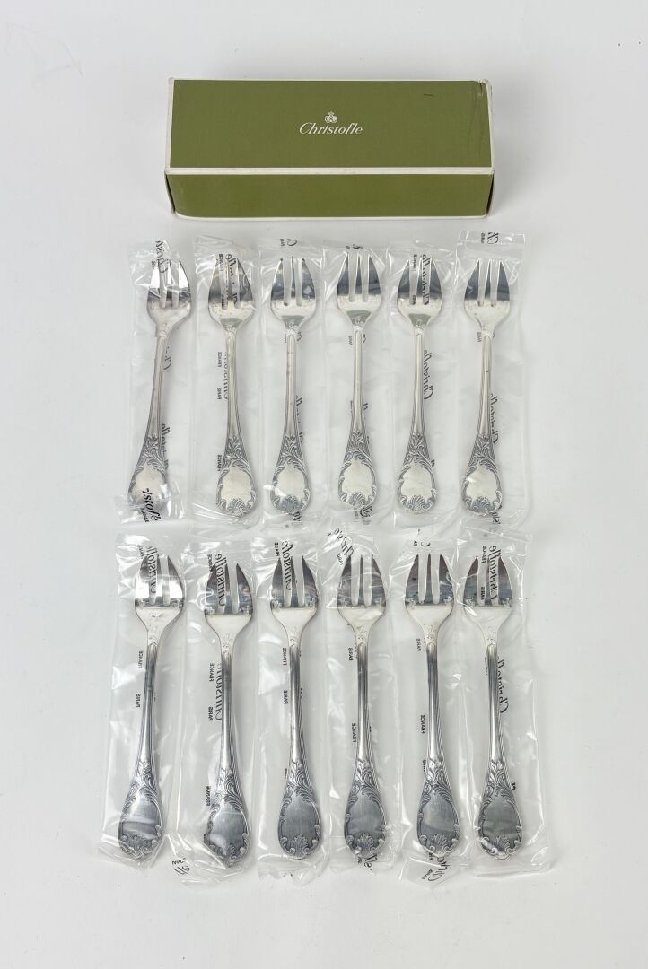 CHRISTOFLE Modèle Marly - Suite de 12 fourchettes à huitre en métal argenté Sous blister, dans un coffret