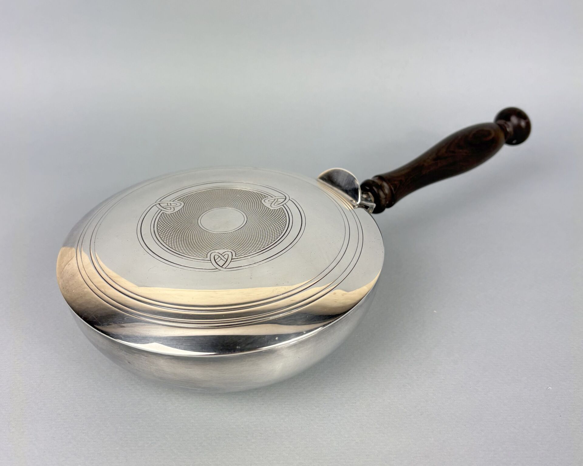 CHRISTOFLE Poubelle de table ou vide cendrier en métal argenté formant poêlon, partiellement guilloché, le manche en ébène tourné