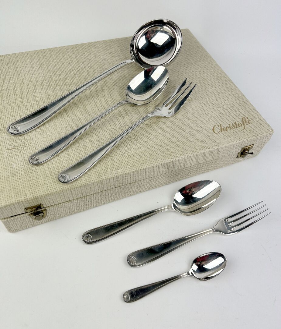 CHRISTOFLE Modèle Coquille - Partie de ménagère en métal argenté comprenant : - 12 Couverts de table - 12 Cuillères à dessert - 1 Louche à potage - 1 Cuillère de service - 1 Fourchette de service Dans leur écrin