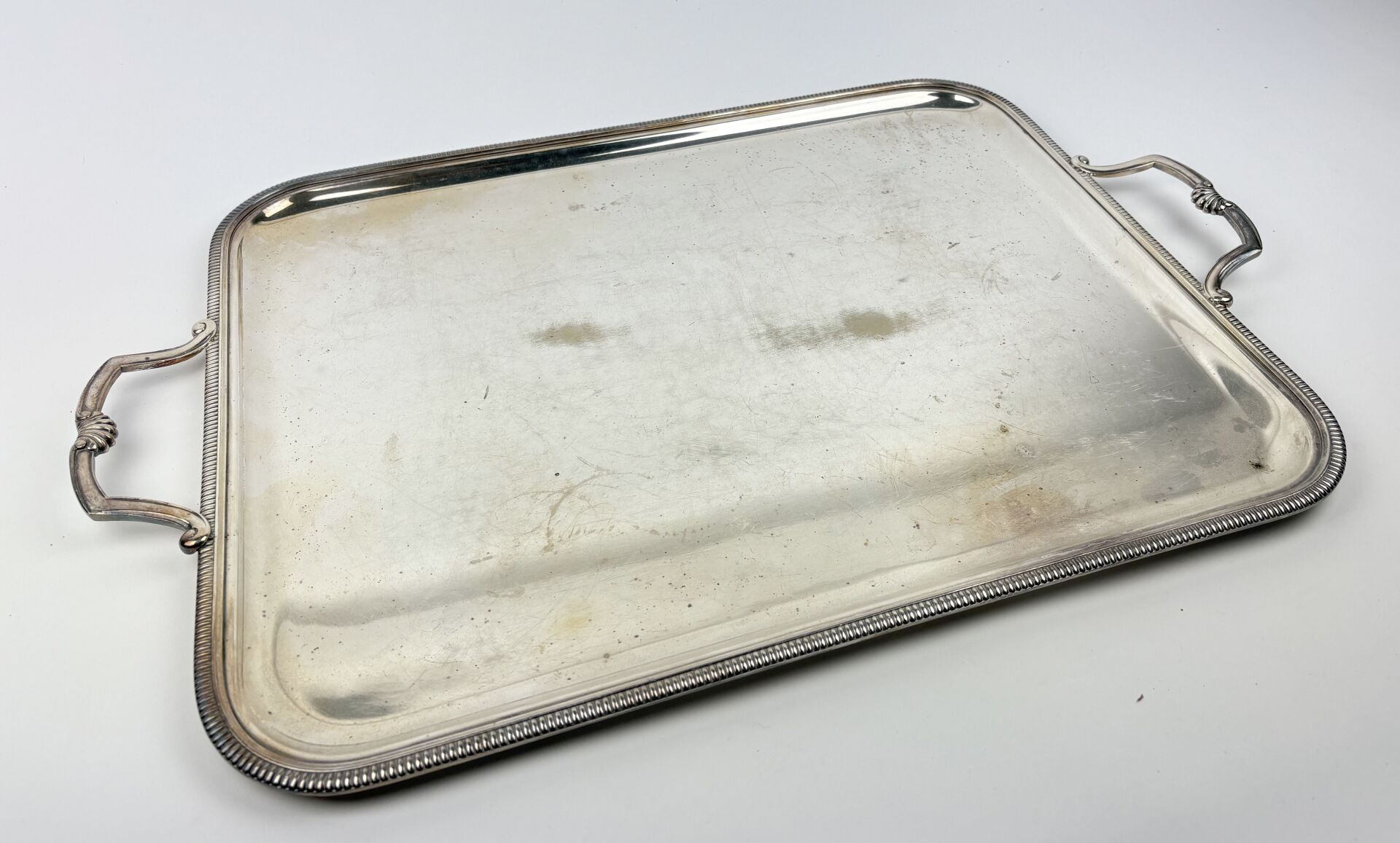 Plateau de service en métal argenté à deux anses à décor de coquilles le bord à décor d'une frise de godrons, Rayures et usures d'usage Dimensions : 44 x 55 cm hors anses