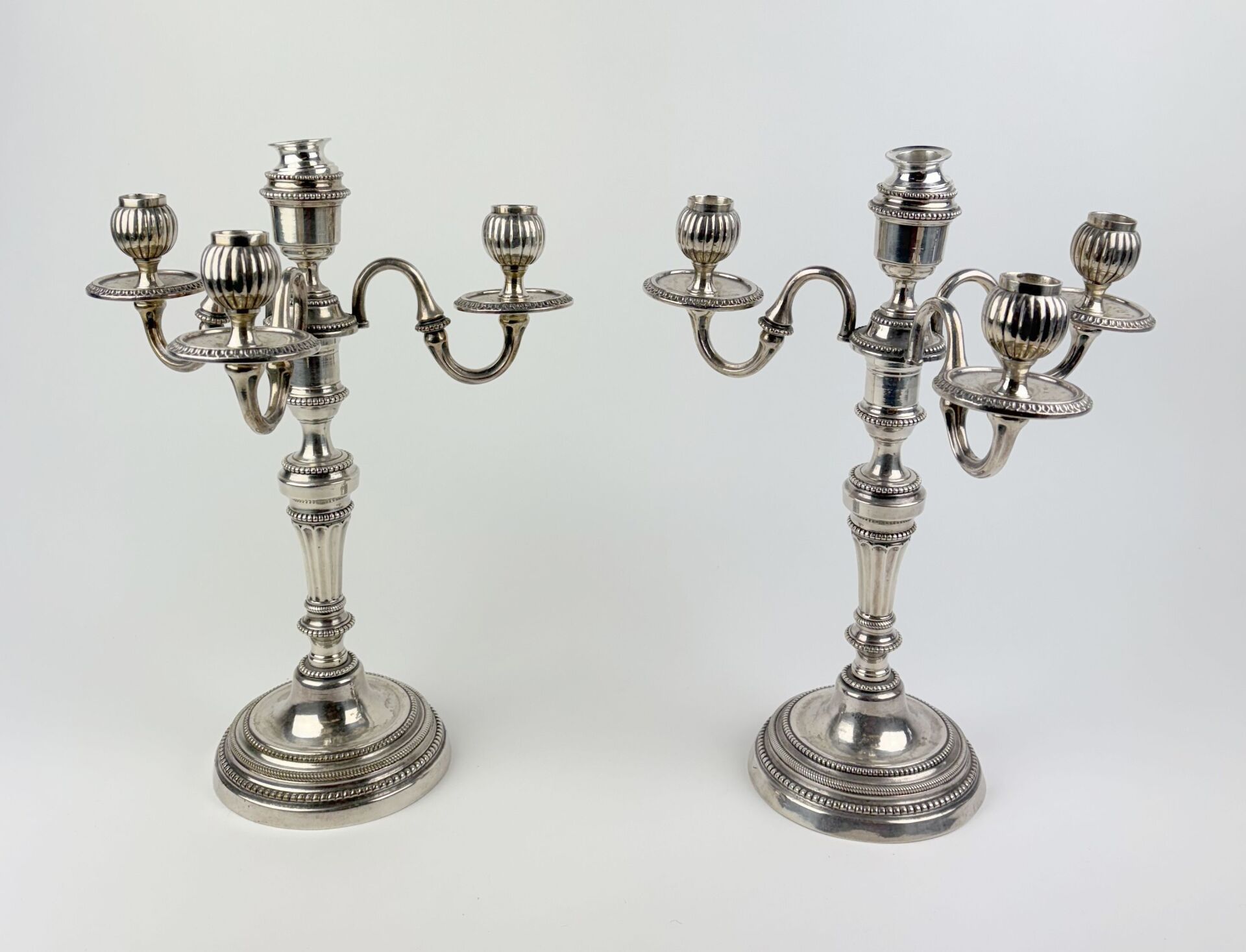Paire de chandeliers à transformation à quatre bras de lumière à décor de rangs de perles et frises de feuilles d'eau, bobèche centrale amovible, pouvant former un flambeau Léger enfoncement à une bobèche H : 38 cm