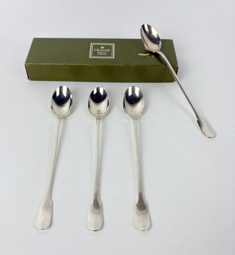 CHRISTOFLE Modèle Cluny - Suite de quatre cuillères à cocktail en métal argenté Dans une boite