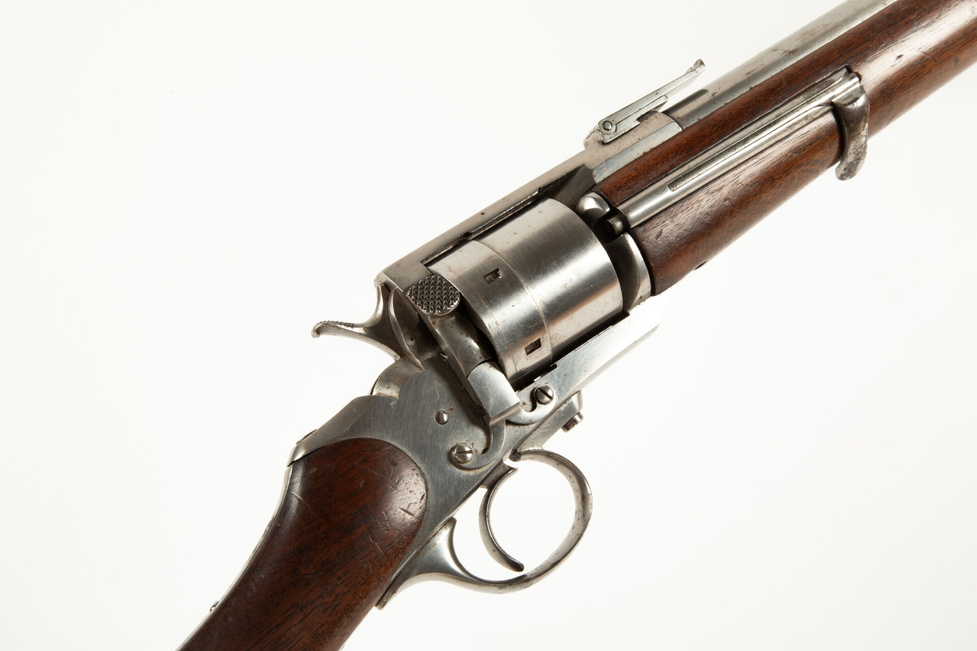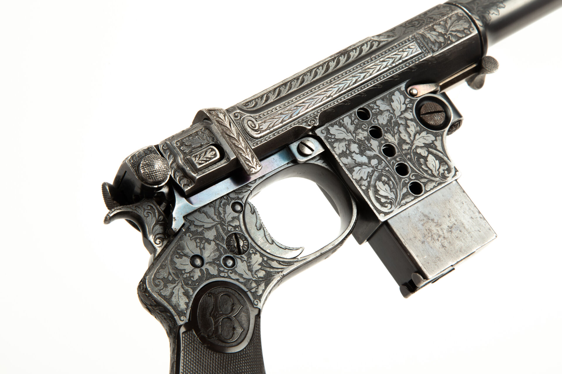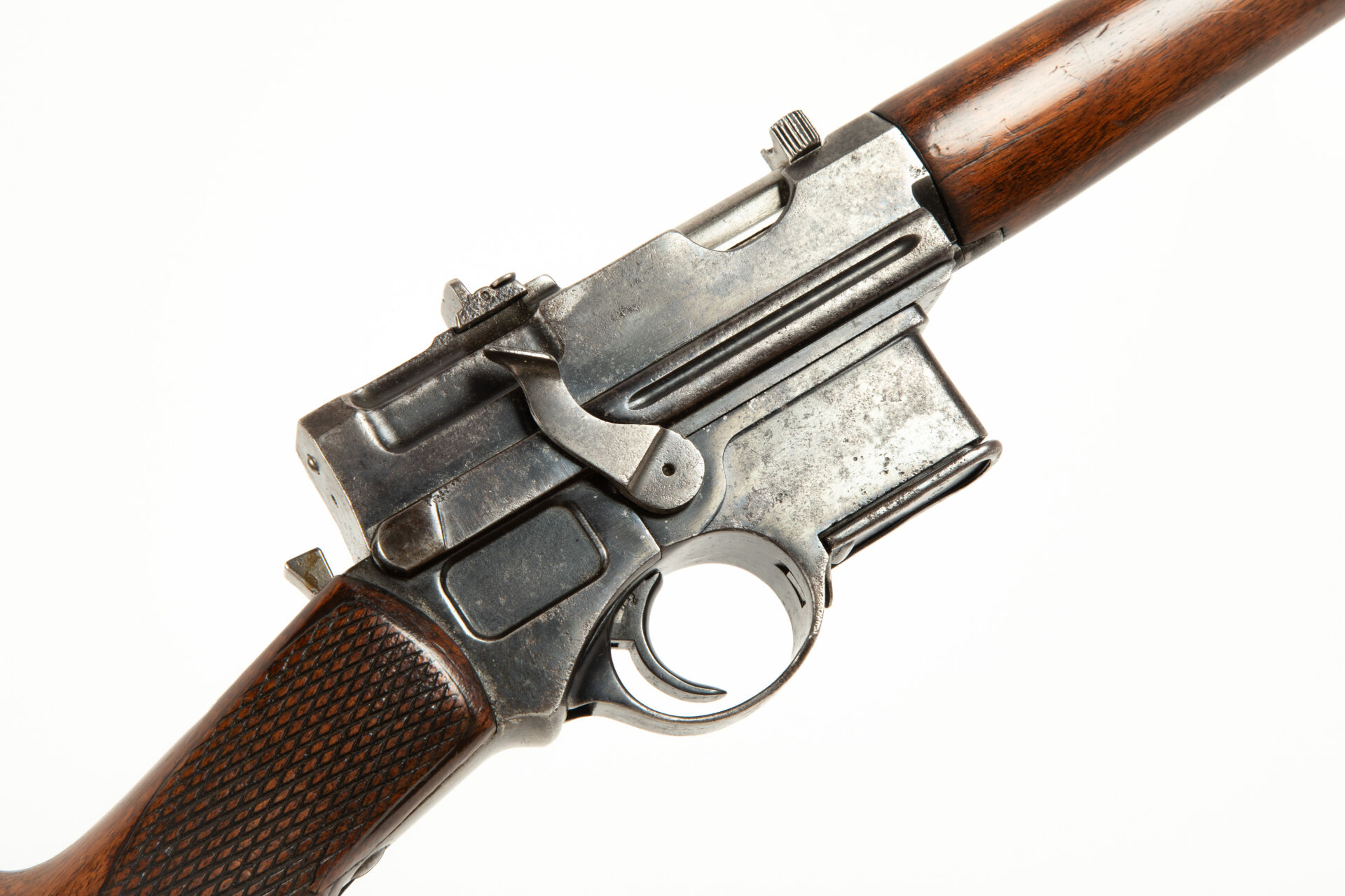Carabine semi-automatique Bergmann 1897 numéro 5 calibre 7,8 mm Bergmann 1ere version (Bouton d'armement de culasse quadrillé, guidon sur queue d'aronde, quadrille plus large au bouton de démontage de la fourrure du tubes, ouïes rondes sur le puit de chargeur plus grandes et plus rapprochées