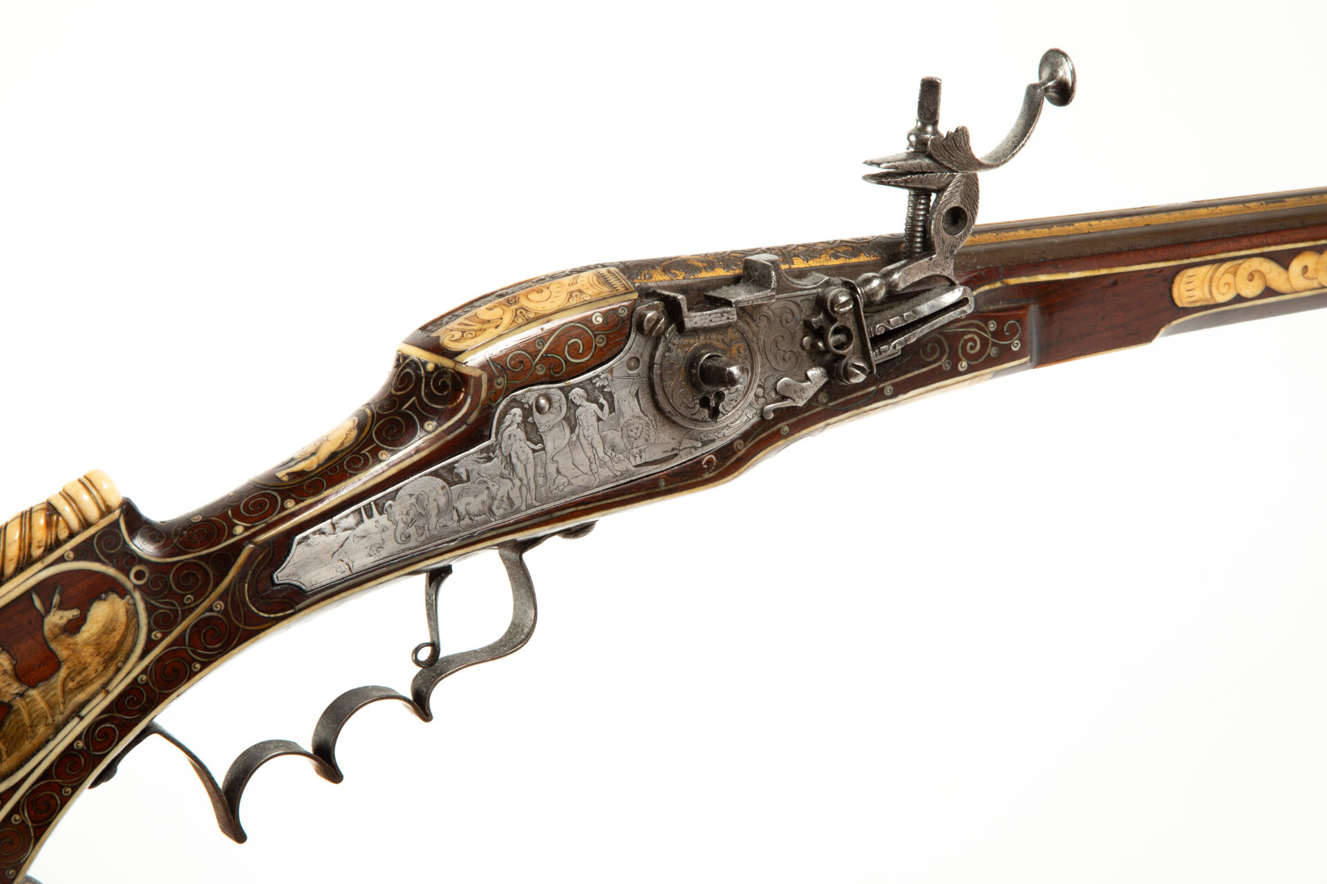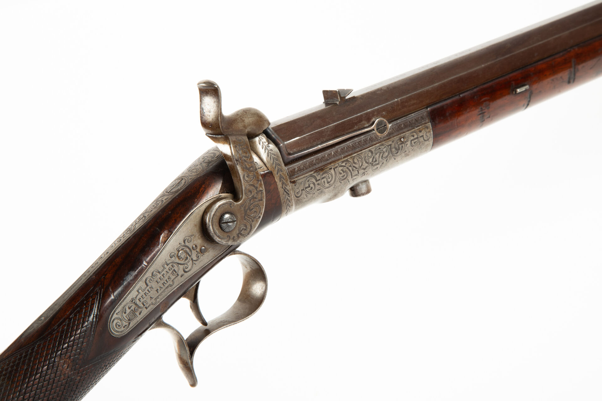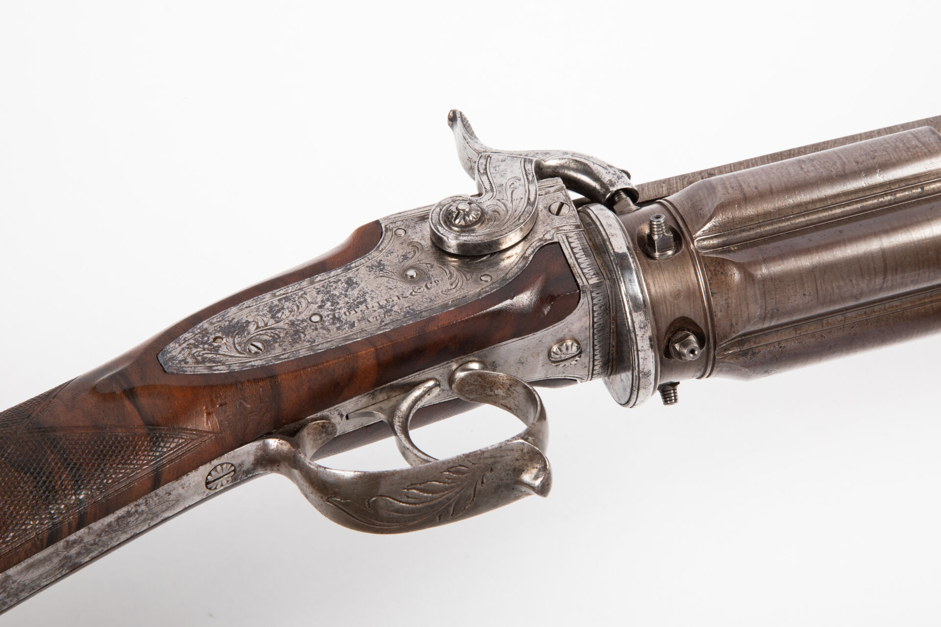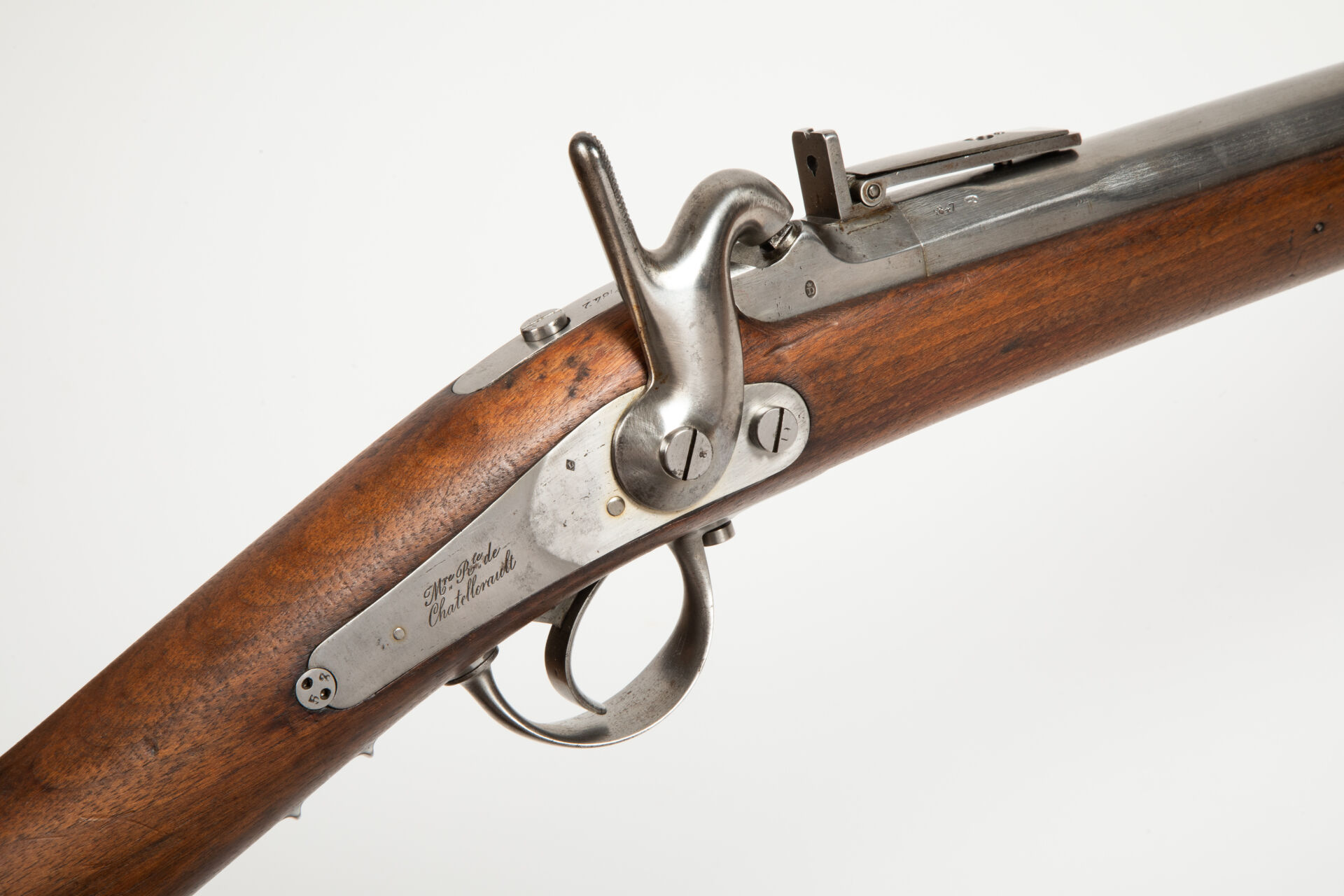 Carabine semi-automatique Bergmann 1897 numéro 5 calibre 7,8 mm Bergmann 1ere version (Bouton d'armement de culasse quadrillé, guidon sur queue d'aronde, quadrille plus large au bouton de démontage de la fourrure du tubes, ouïes rondes sur le puit de chargeur plus grandes et plus rapprochées