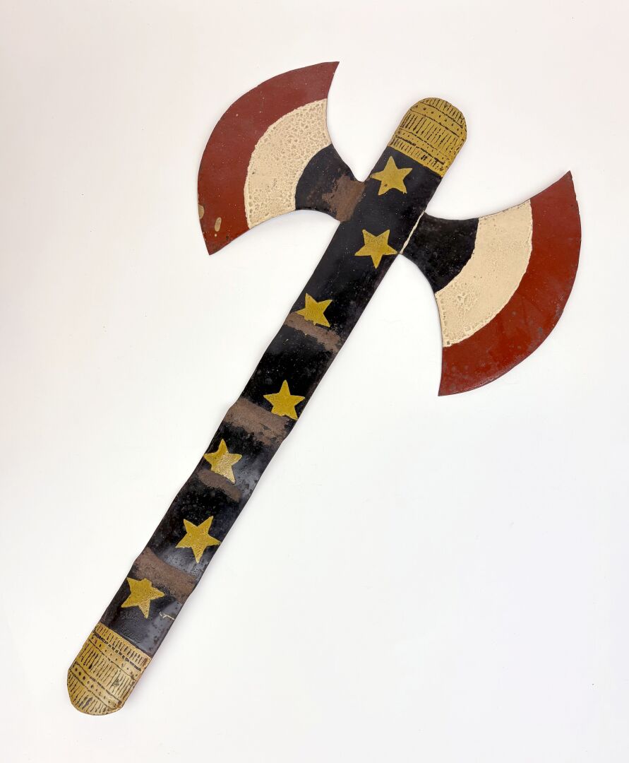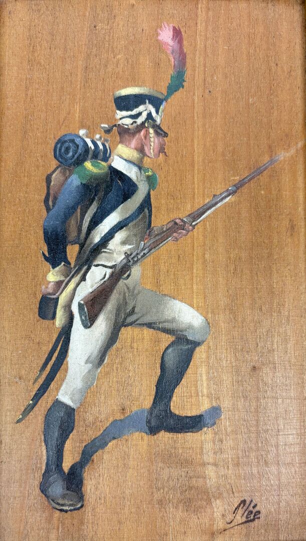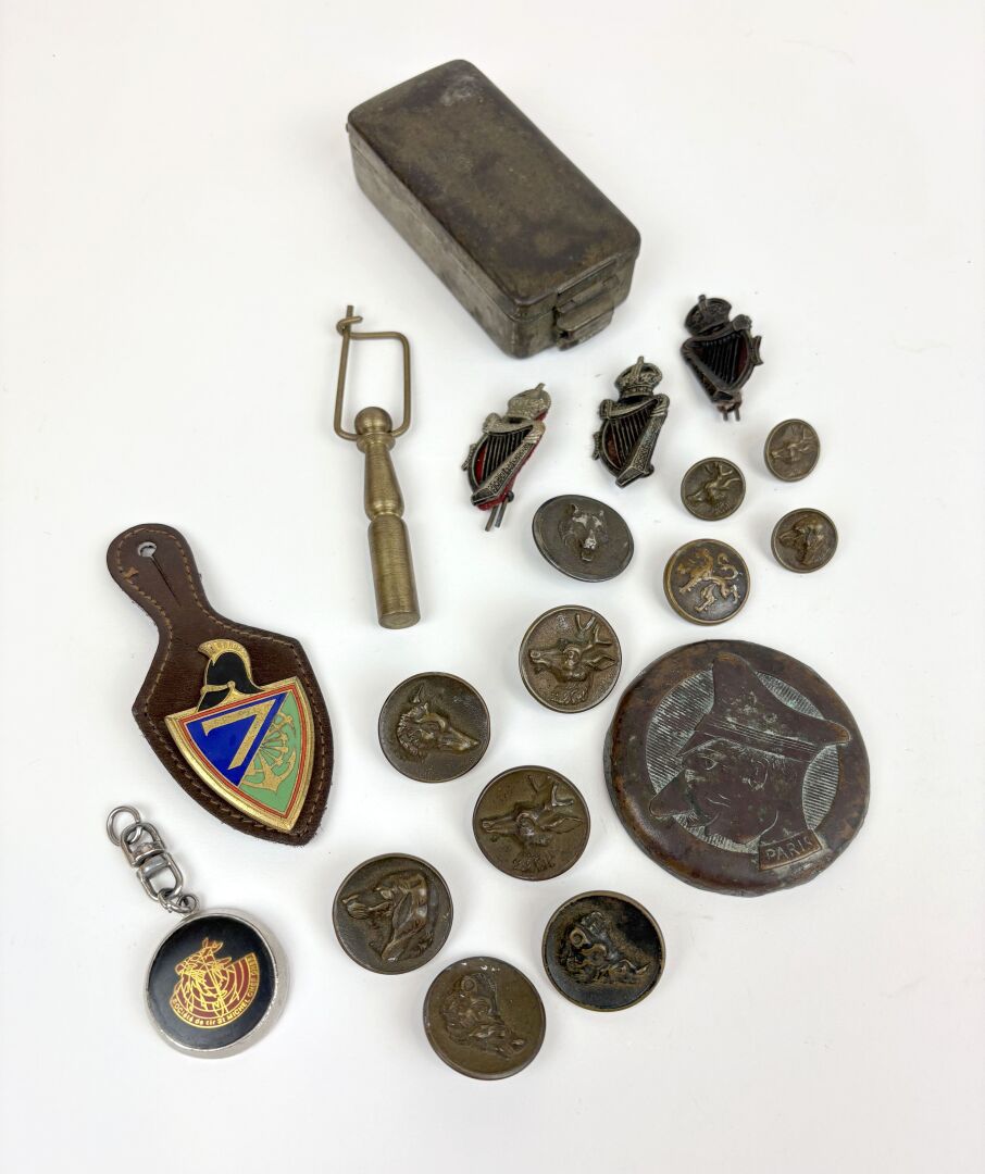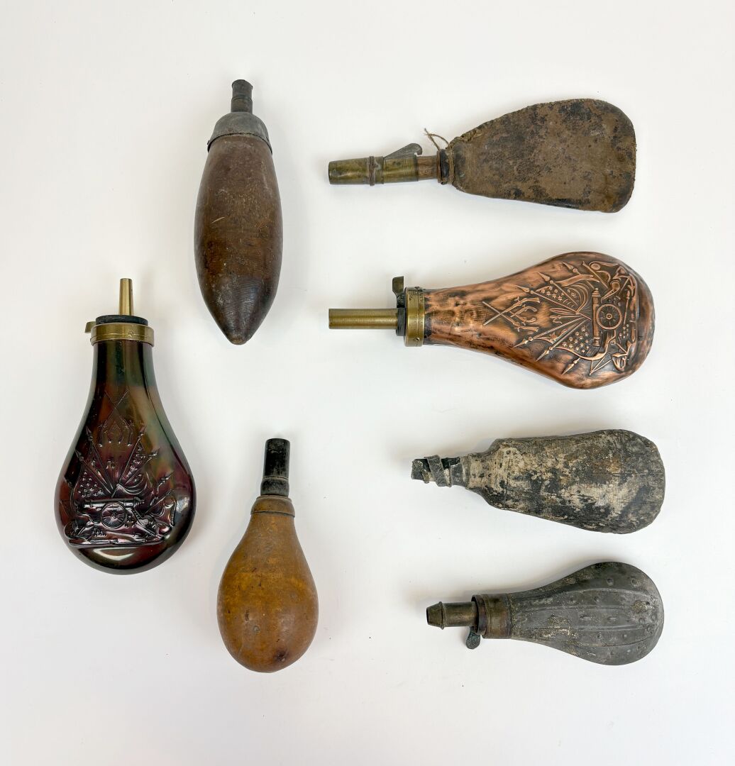 Lot de sept poires à poudre diverses, certaines modernes (2), une de petite proportion en zinc écrasé, une en cuir, une en carton et deux fabriquées à partir de fruits secs (coloquintes) une à bouchon vissé et une à poussoir. Etat 2