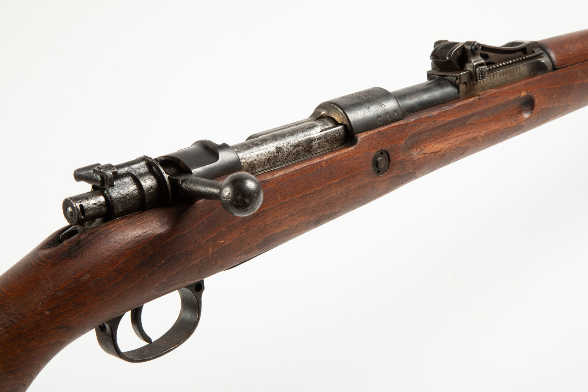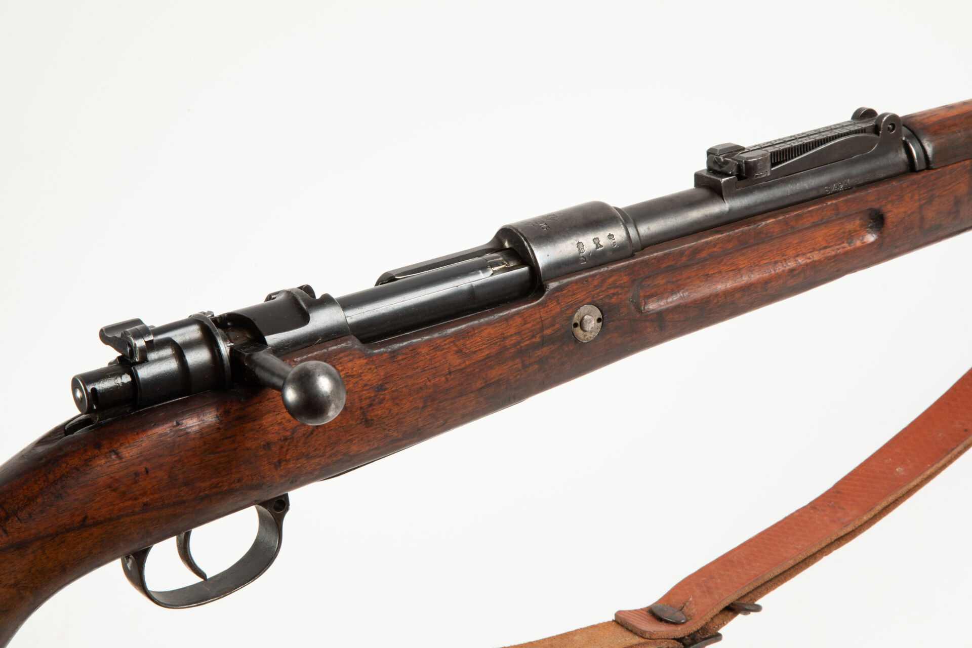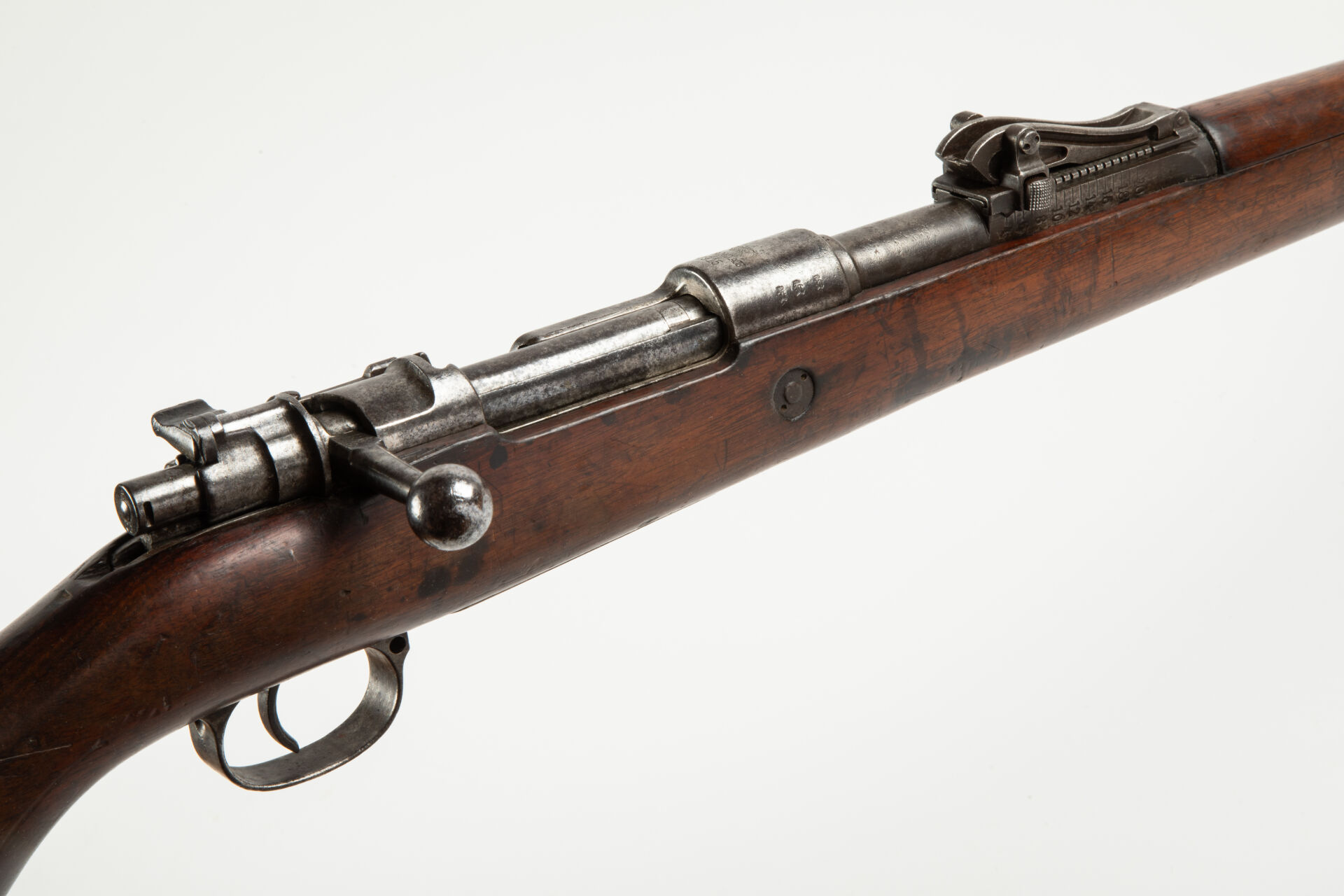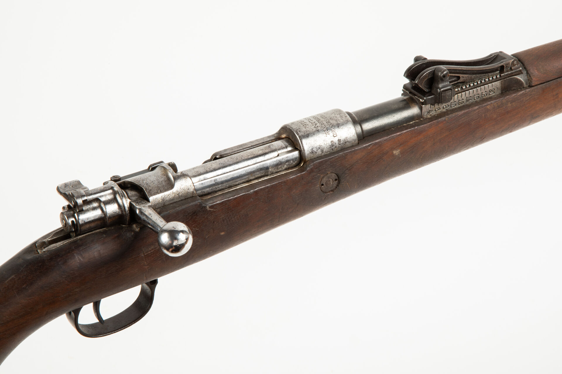 Fusil règlementaire allemand Mauser 1898, fabrication D.W.M 1905, canon modifié "S", arme composite. Monture tardive avec oeillet de démontage de percuteur et fraisage dans la monture sous la crosse. Hausse commencant à 400 m. Bon canon pour le tir. Mécanisme fonctionnel. Arme n°5758 Etat 2 Arme