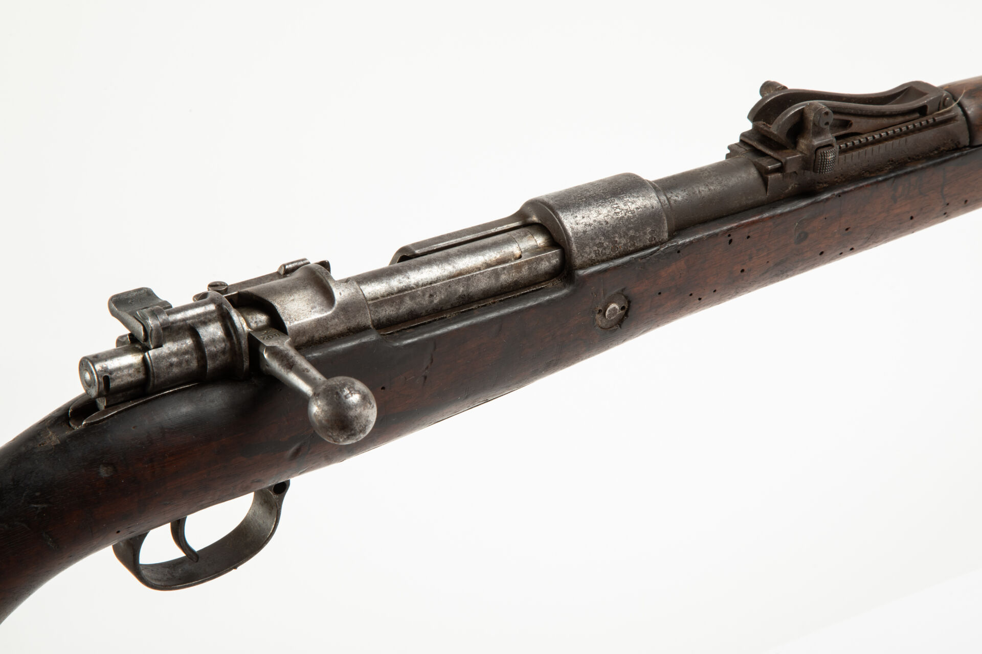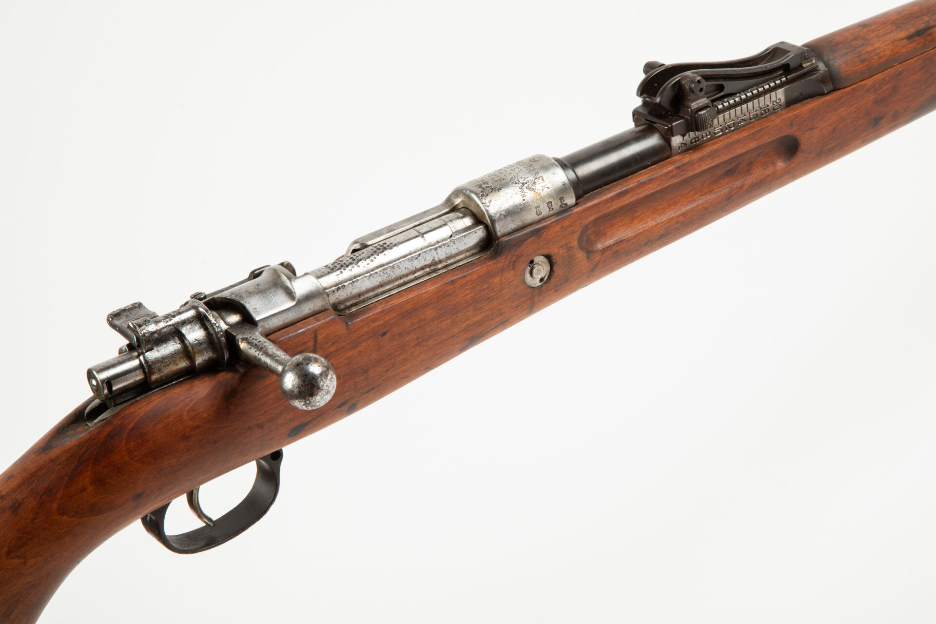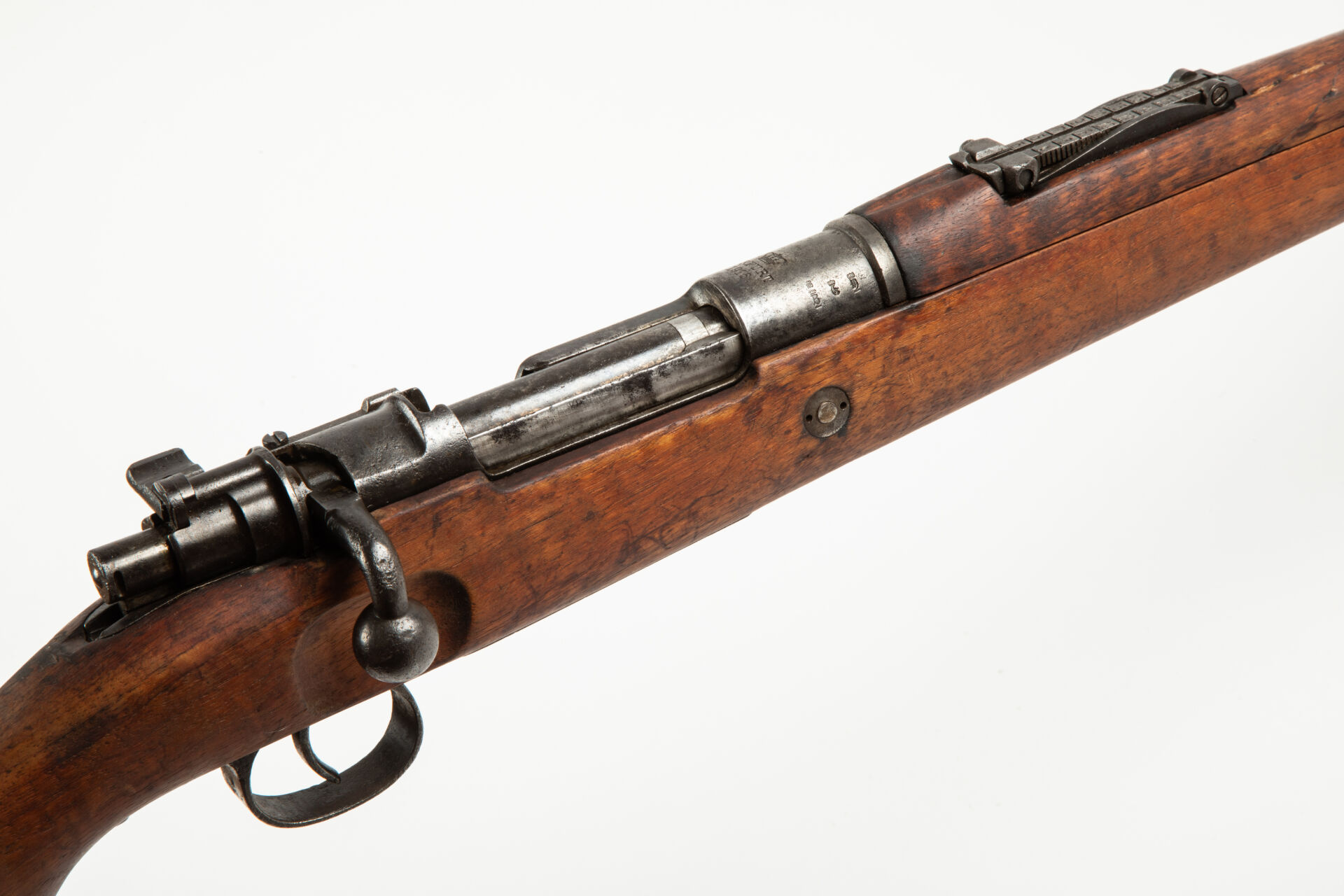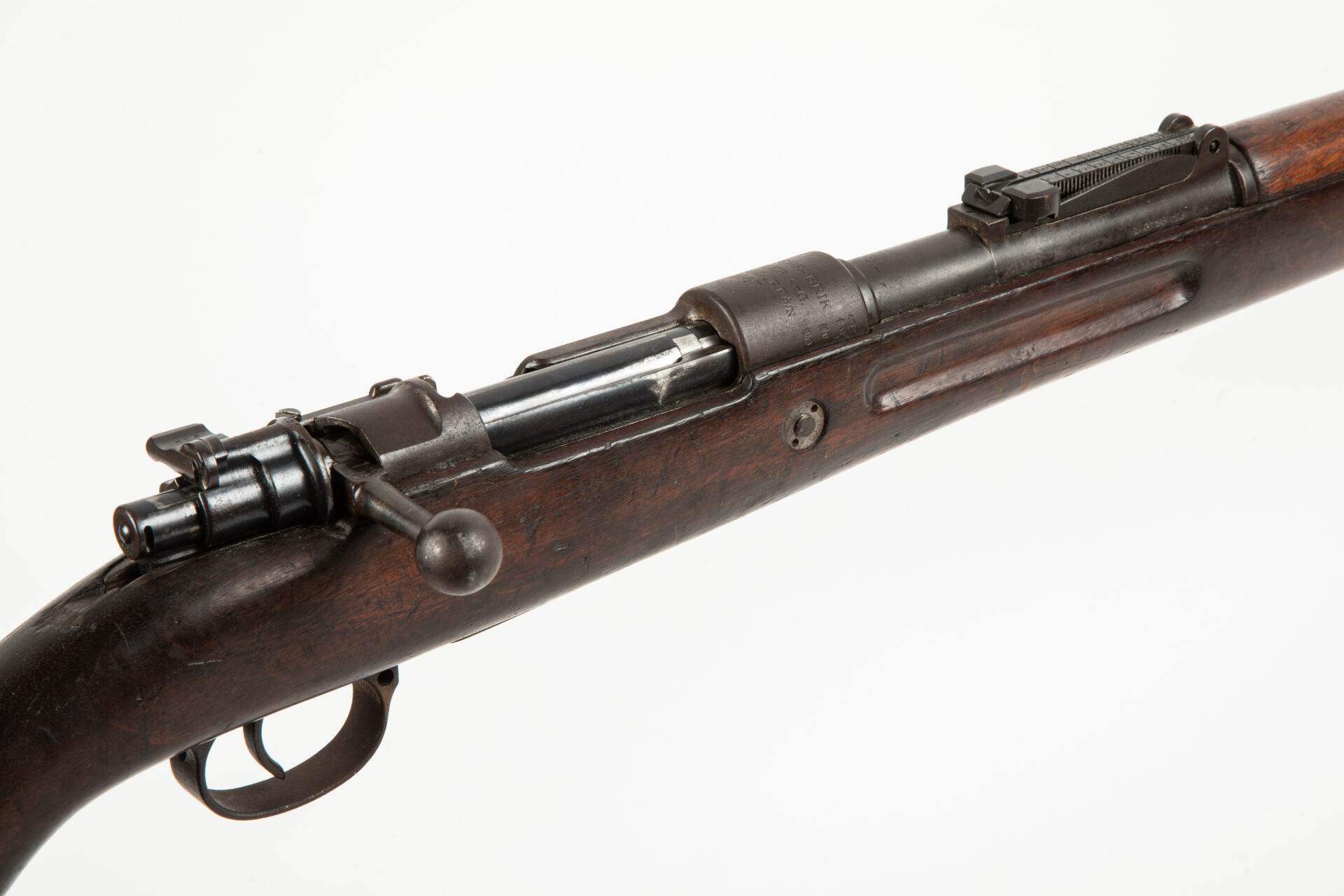 Fusil règlementaire allemand Mauser 1898, fabrication D.W.M 1905, canon modifié "S", arme composite. Monture tardive avec oeillet de démontage de percuteur et fraisage dans la monture sous la crosse. Hausse commencant à 400 m. Bon canon pour le tir. Mécanisme fonctionnel. Arme n°5758 Etat 2 Arme