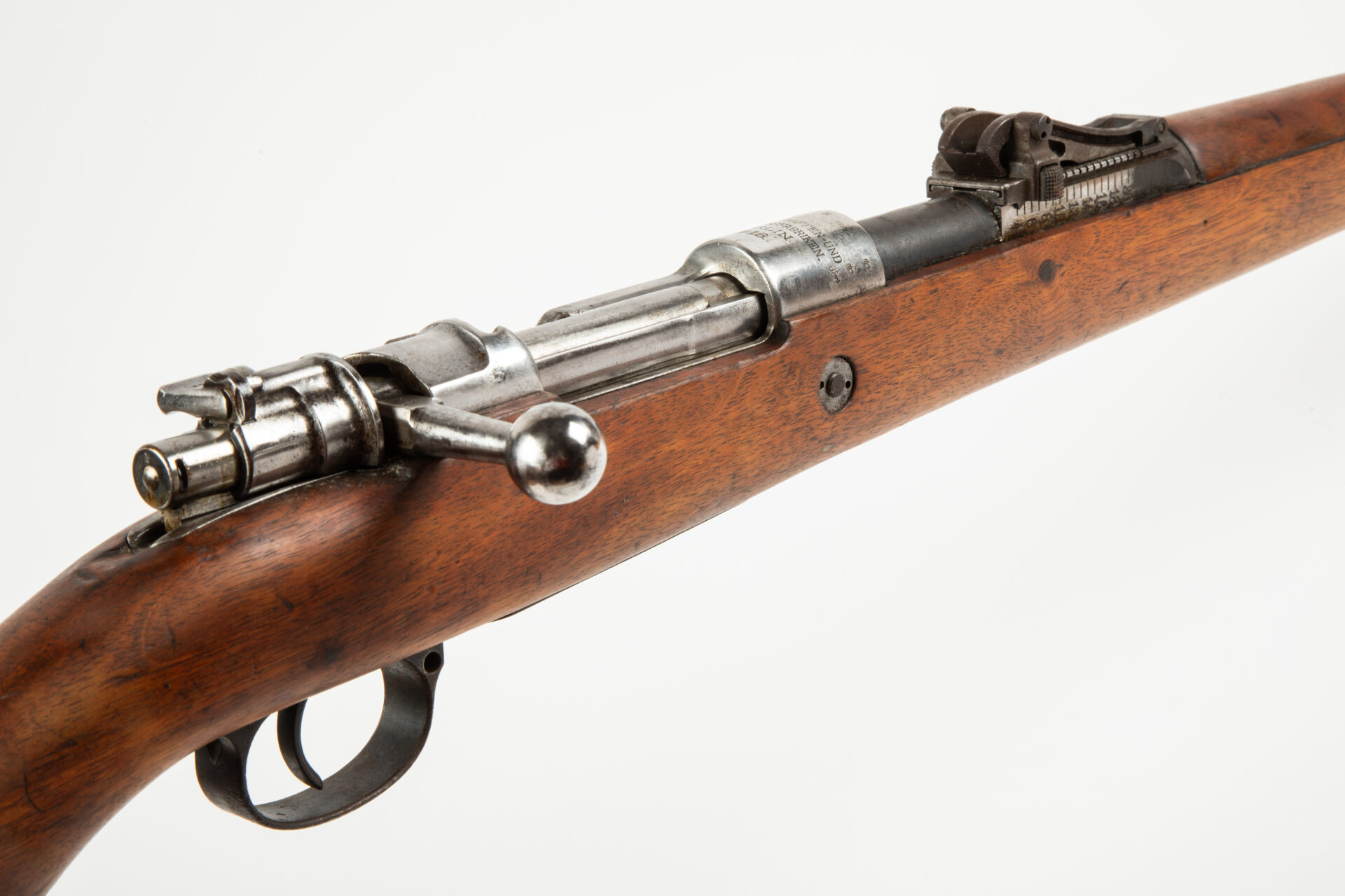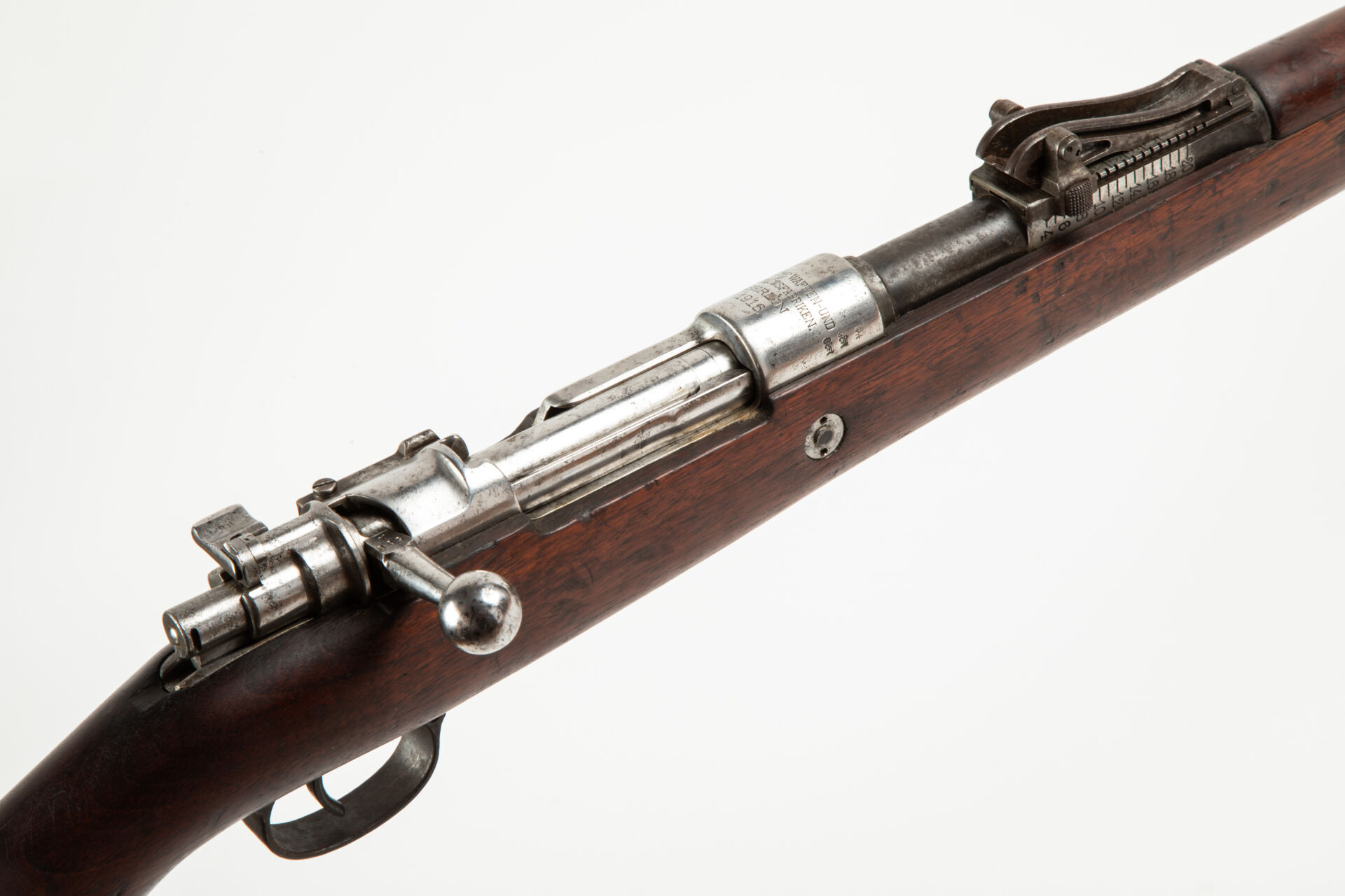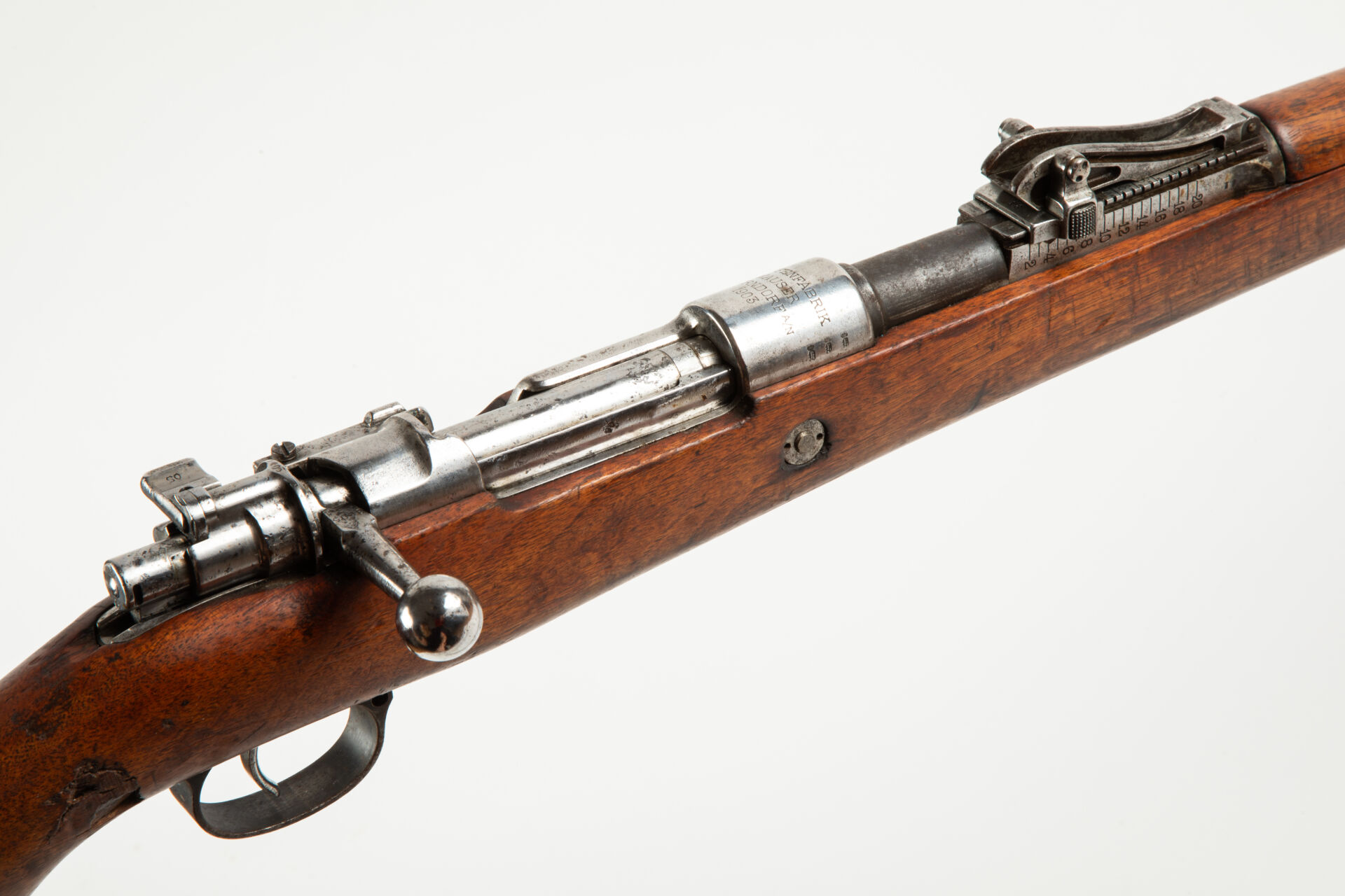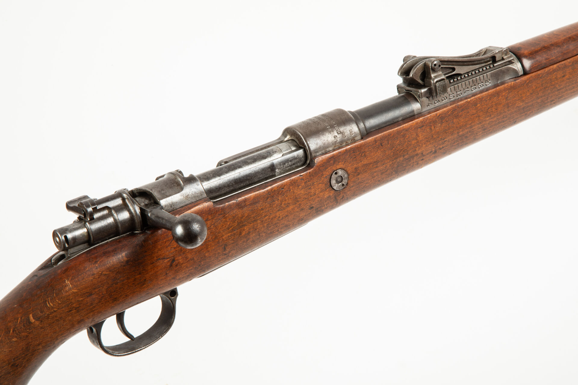 Fusil règlementaire allemand Mauser G98, fabrication Waffenfabrik Mauser A-G Oberndorf A/N en 1903. Arme non monomatricule, modification "S", hausse commençant à 200 mètres, poignée de crosse impactée par un éclat d'obus n'affectant pas sa solidité, macaron de crosse régimenté 160.R.8.18 (18 eme arme de la