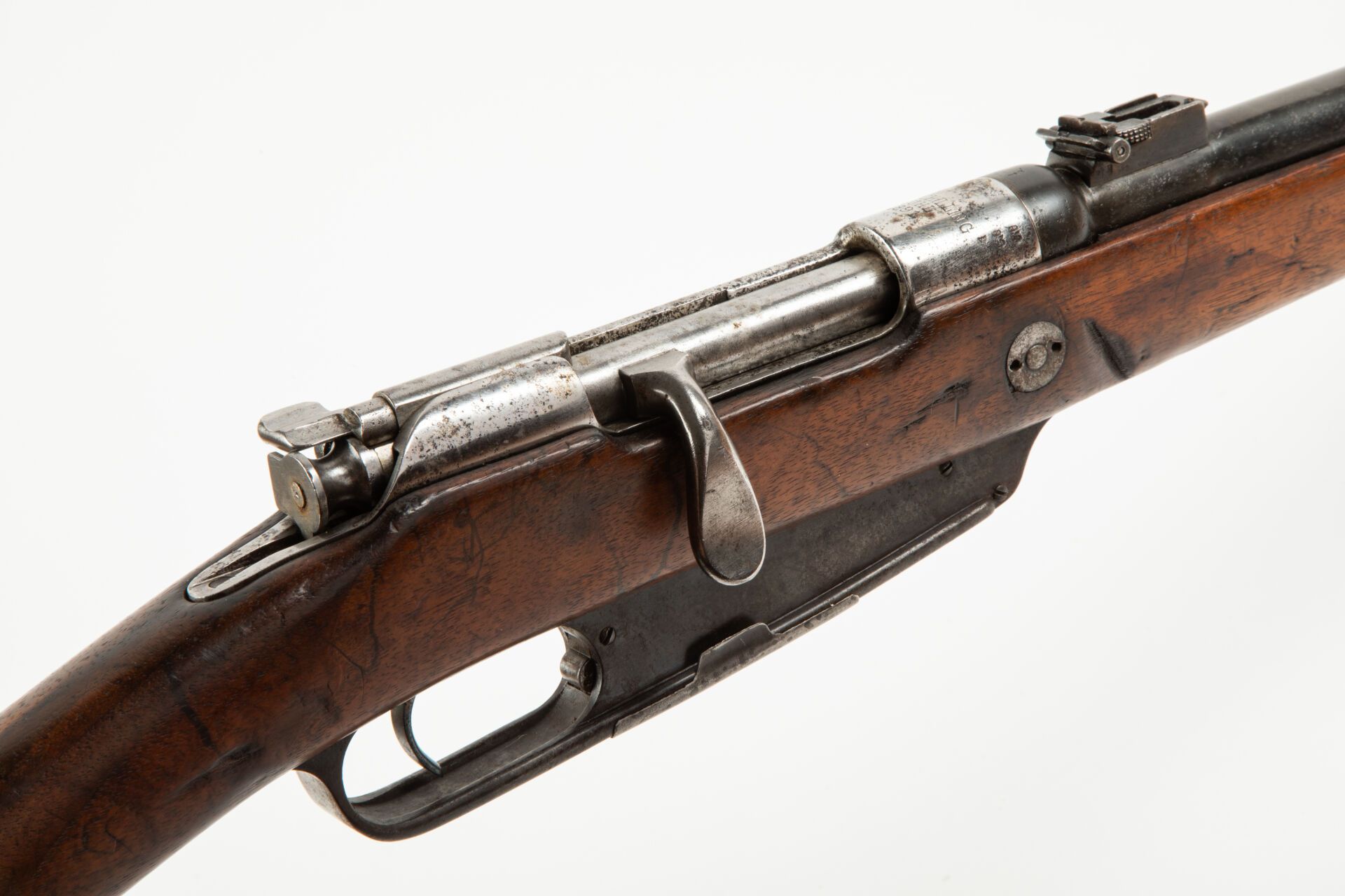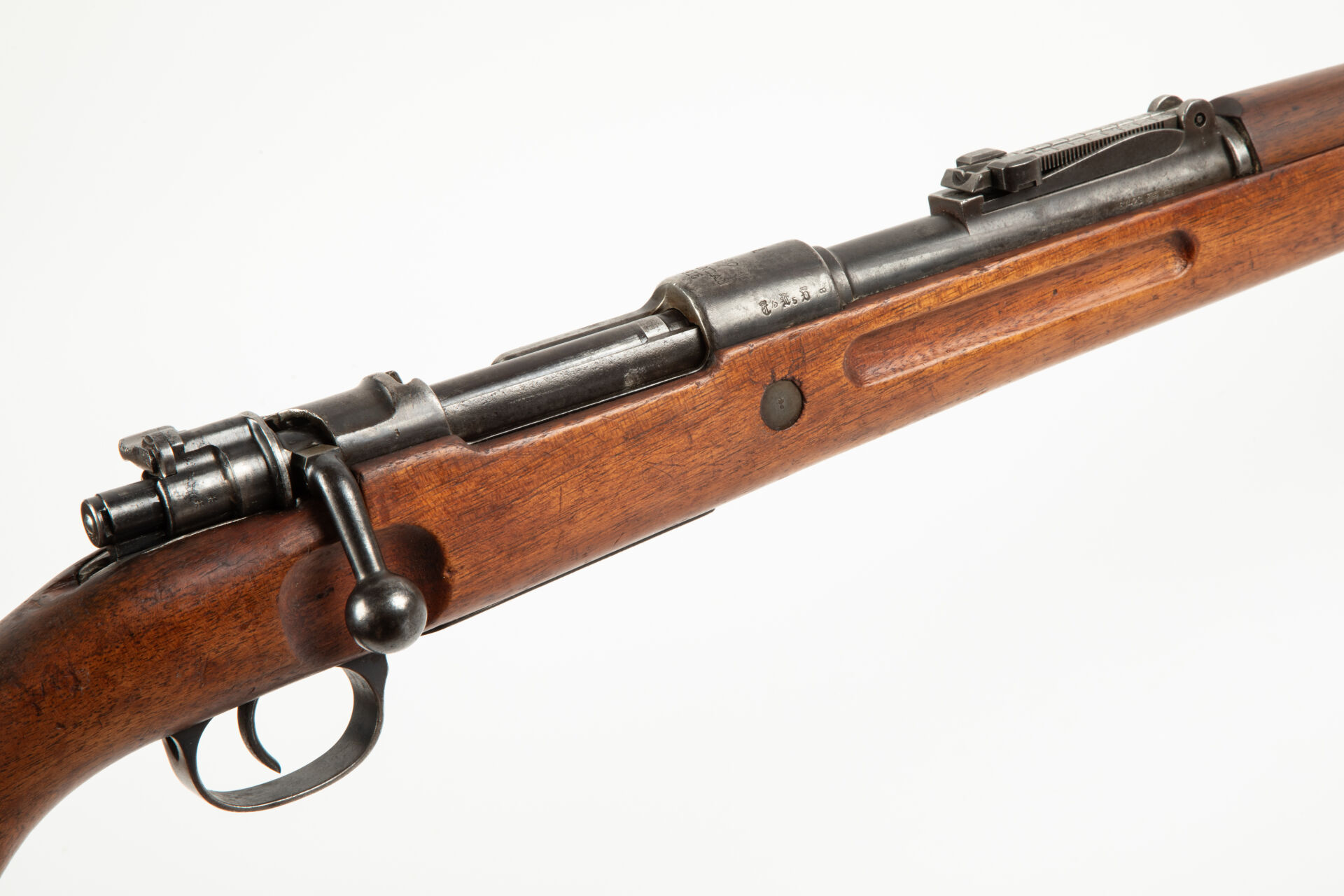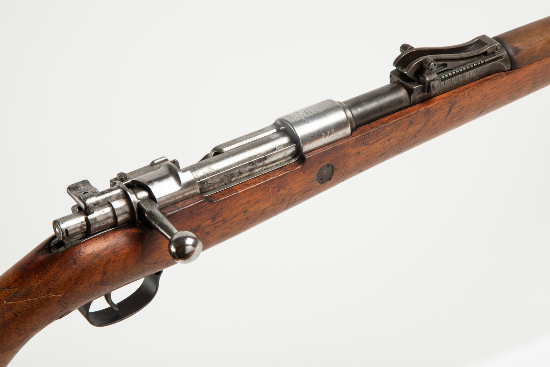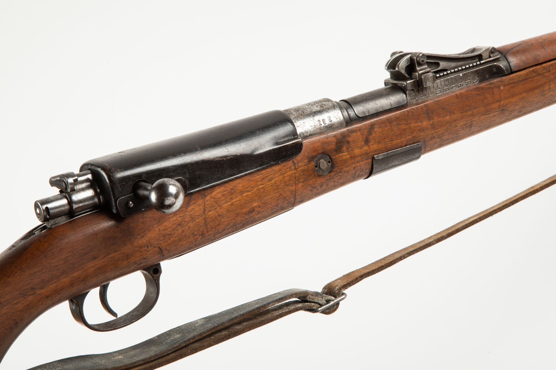 Fusil règlementaire allemand Mauser G98, fabrication Waffenfabrik Mauser A-G Oberndorf A/N en 1903. Arme non monomatricule, modification "S", hausse commençant à 200 mètres, poignée de crosse impactée par un éclat d'obus n'affectant pas sa solidité, macaron de crosse régimenté 160.R.8.18 (18 eme arme de la