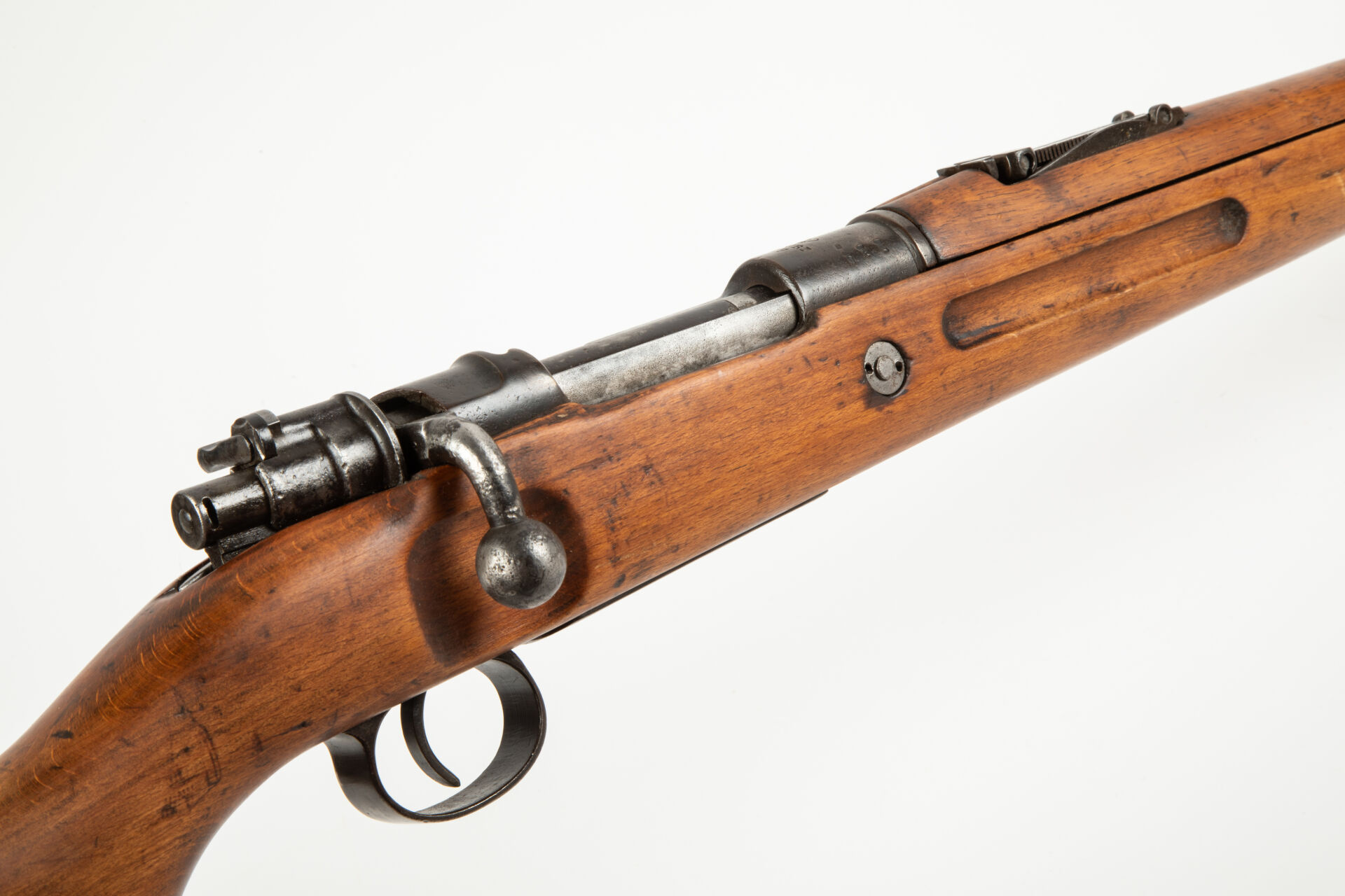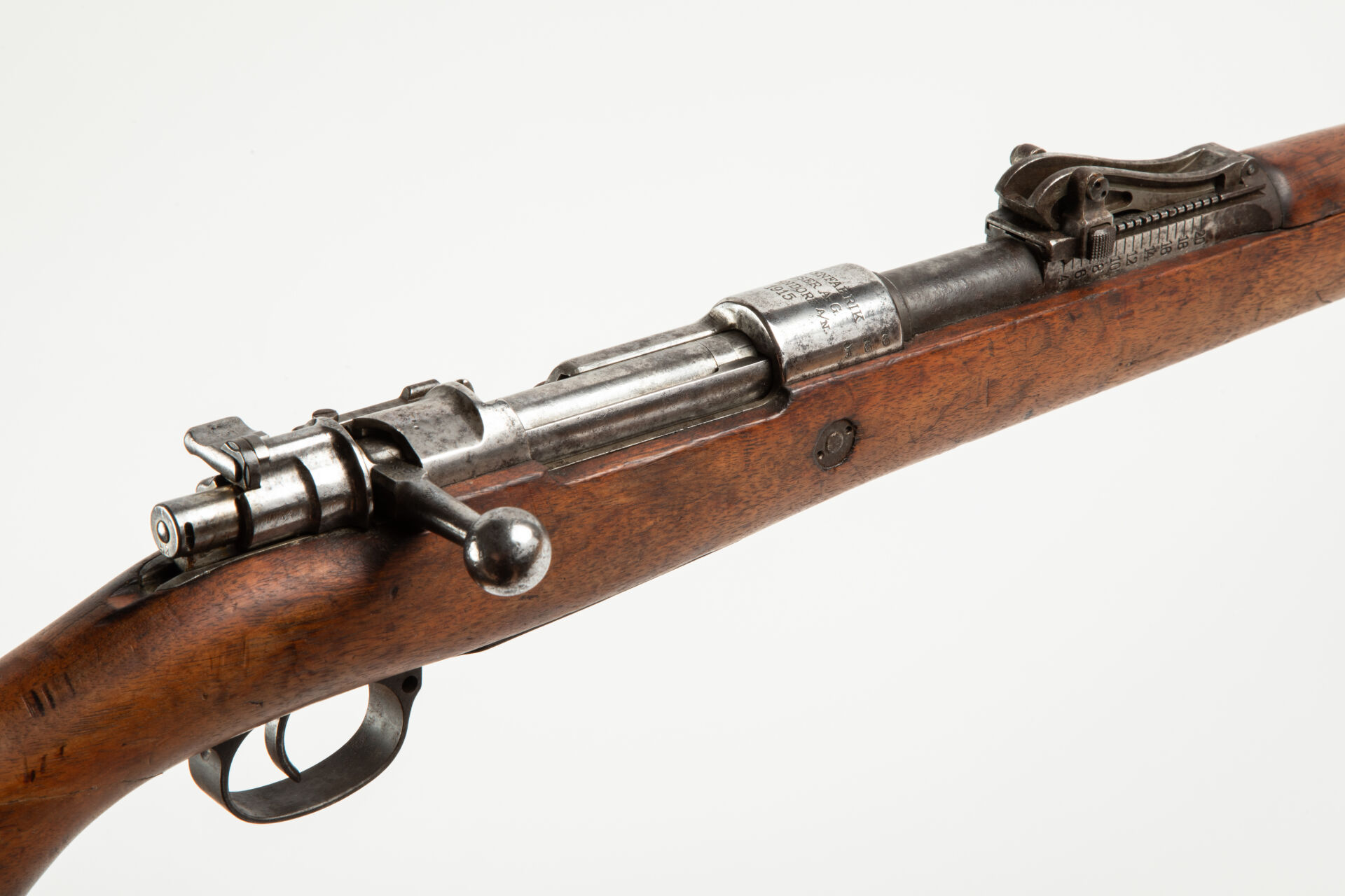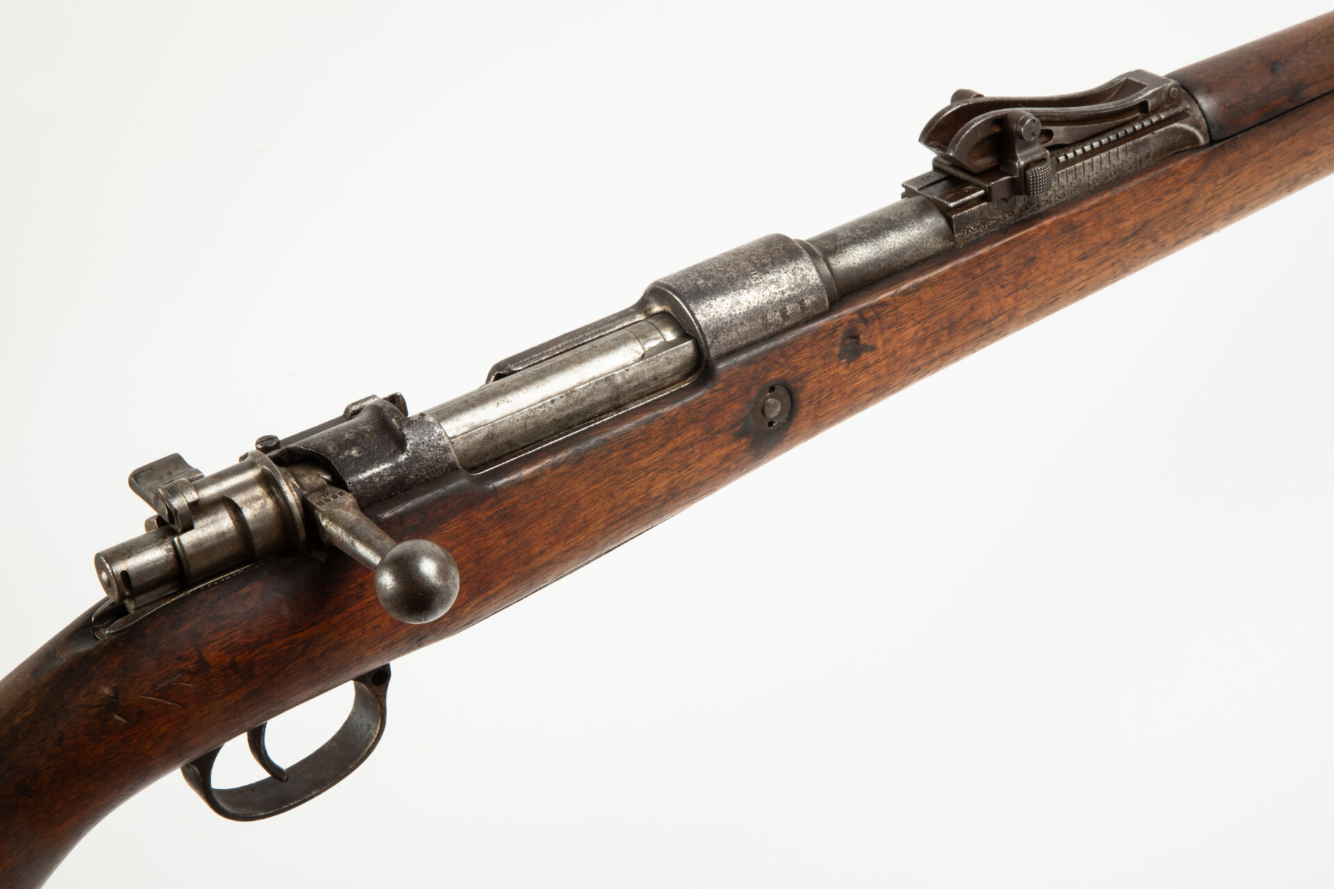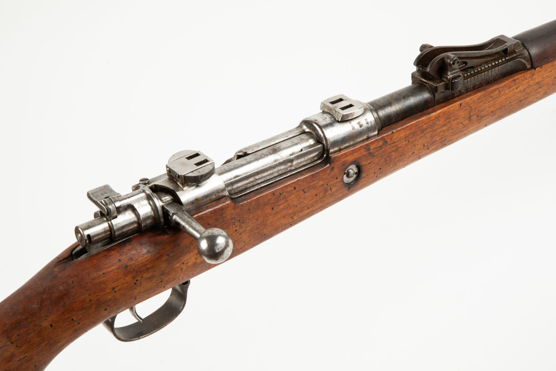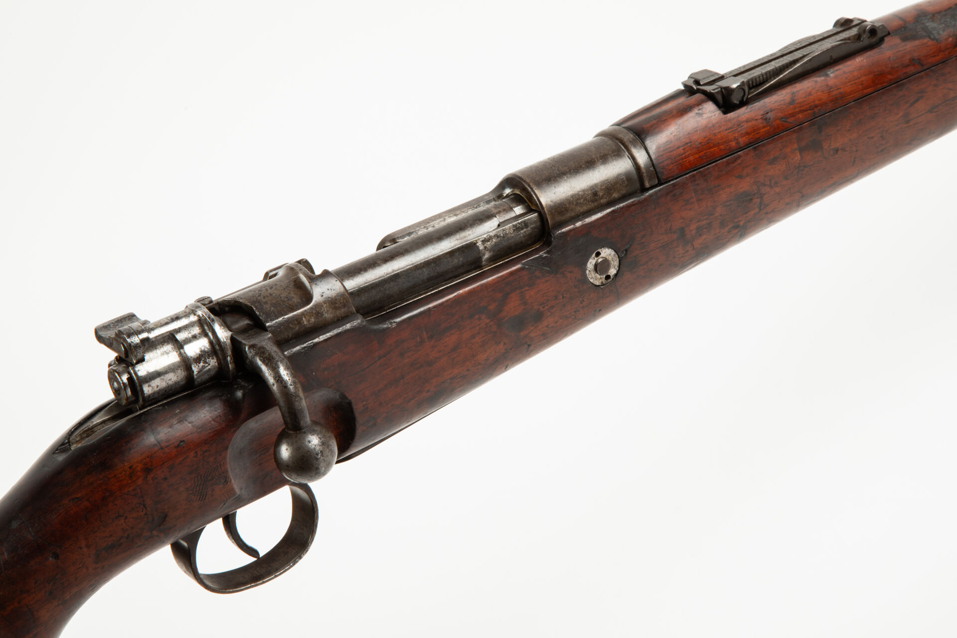 Karabiner 98, fabrication Erfurt 1908, arme monomatricule sauf la noix et le drapeau, légère oxydation générale, avec son rare bouchon de canon à clapet spécifique pour le modèle, mécanisme fonctionnel avec sa bretelle. Arme n°2982 Etat 1- Arme de Catégorie C
