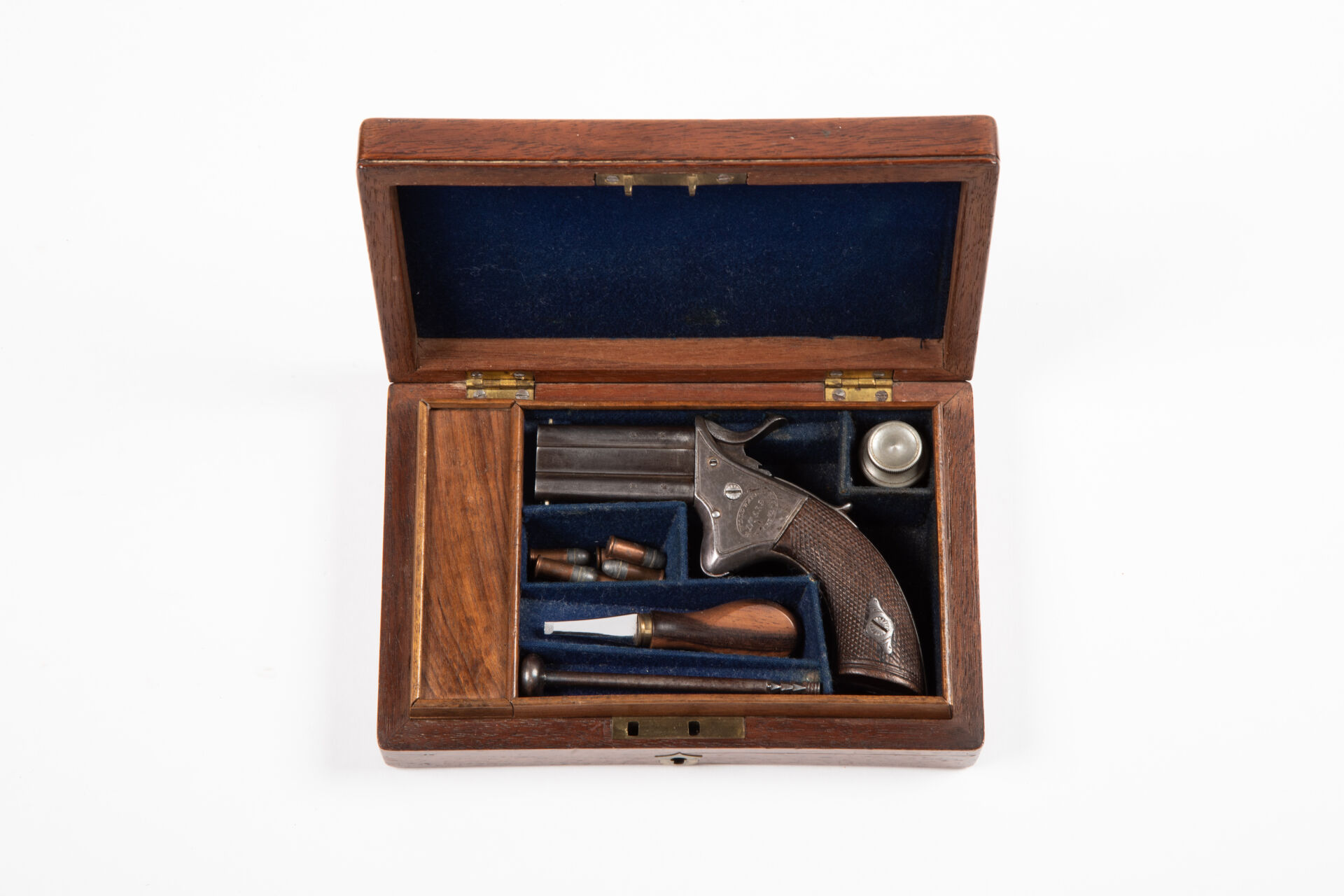 Beau petit revolver à brisure système COUNET numéro 21213. Arme polie blanc montée avec une crosse en ébène piriforme retenue par de petites rosettes métalliques finement décorées. Canon à 7 pans calibre 320. Détente repliable, ouverture par un levier vertical, placé sur le flanc gauche